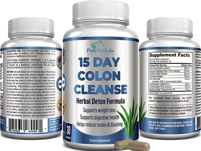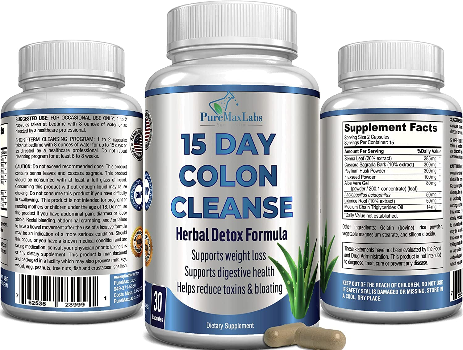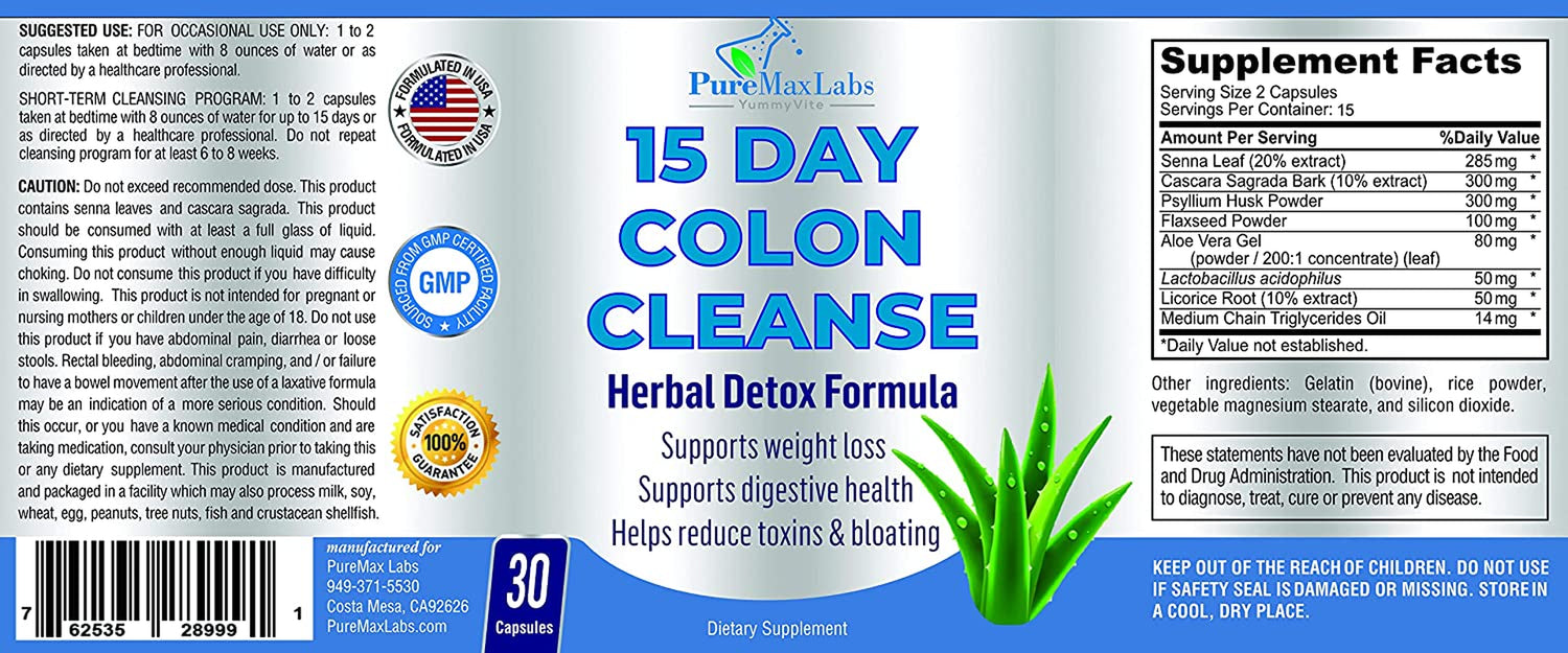 - HIGH QUALITY MADE IN USA IN GMP CERTIFIED FACILITY — PureMax Labs 15 Day Colon Cleanse Herbal Detox Formula is made in the USA in a FDA inspected, Good Manufacturing Practice Certified facility from premium natural ingredients with no artificial ingredients or preservatives. You can be assured of consistent high quality.