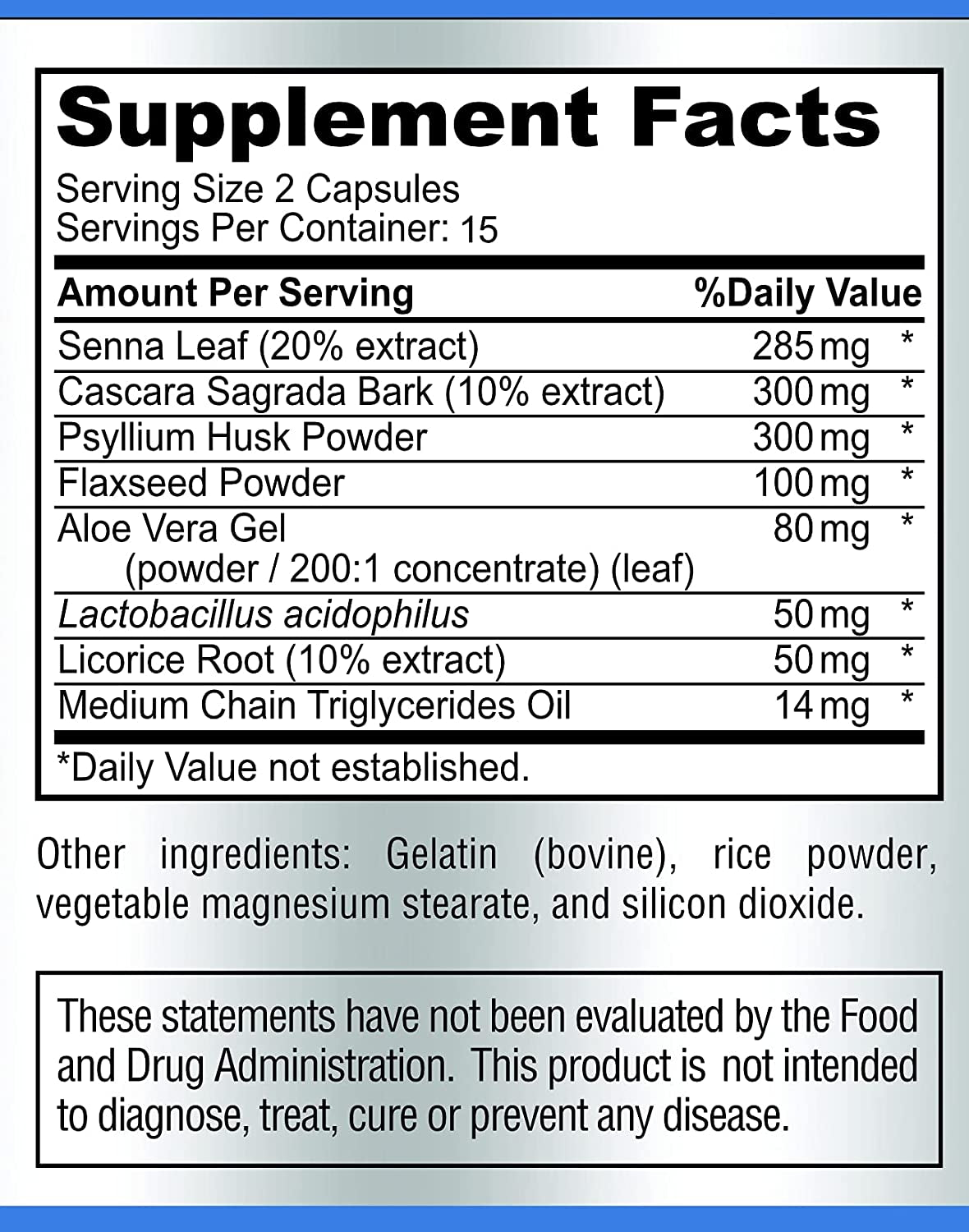 Our herbal colon detox formula uses natural herbs such as senna, cascara sagrada and aloe vera, psyllium husk prebiotic fiber and acidophilus probiotic bacteria to gently cleanse and remove toxins from your body. It is a natural laxative that helps your body remove waste and detoxify. You’ll have more energy, feel lighter and healthier.