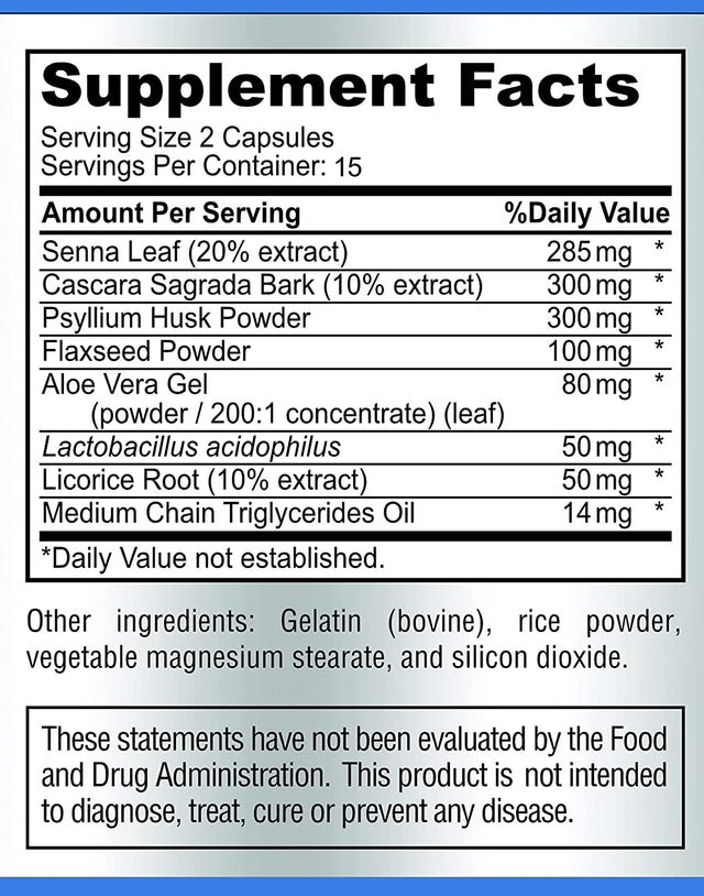 Take one or two capsules before bedtime with a glass of water. For a more gentle cleanse take one capsule a day. Do not use for more than 15 days at a time. Can be used for just one or two days to relieve constipation or digestive issues, or in a more thorough colon cleansing program for up to a maximum of 15 days at a time.