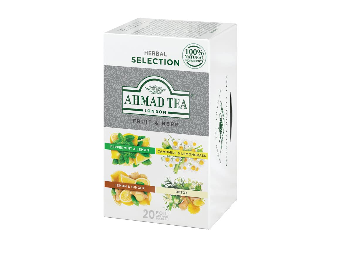 Ahmad Tea Herbal Tea, Fruit and Herb Selection, 4 Teas Peppermint and Lemon, Camomile and Lemongrass, Lemon and Ginger, and Detox Teabags, 20 Ct - Decaffeinated and Sugar-Free