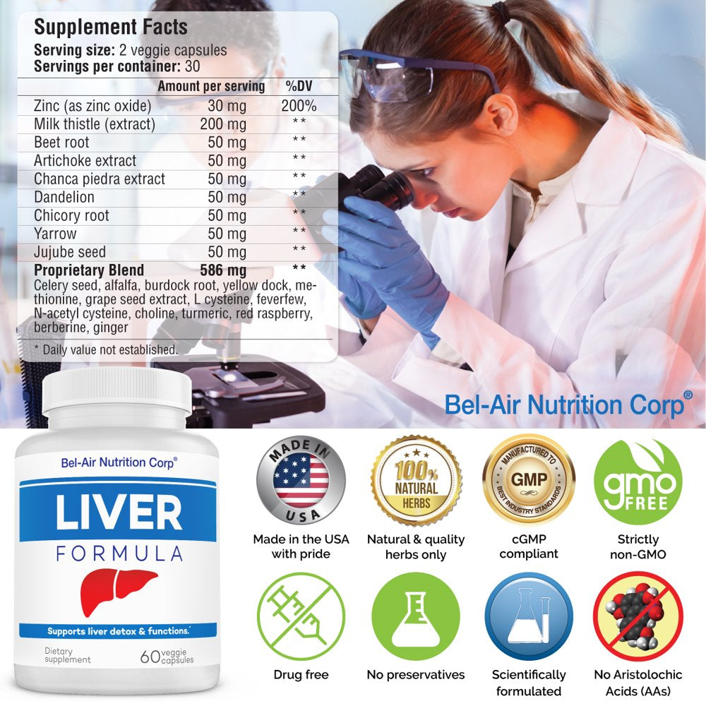 LIVER DETOX + WELLNESS: Supports liver health and detox with proven herbal ingredients: Milk thistle, dandelion extract, artichoke extract, beet root extract, chanca piedra, chicory root extract, and jujube seed.ANTIOXIDANTS & ANTIOXIDANTS: Provide your body with a powerhouse of antioxidant rich herbs: grape seed extract, turmeric, red raspberry, berberine, ginger, celery seed, alfalfa, burdock root, and yellow dockBEST VALUE: Promotes overall health and wellbeing with healthier and stronger liver. Made in USA. By combining ingredients typically taken individually, the benefits of each can now be obtained in a single bottle, offering the best value.QUALITY PRODUCT: This product is manufactured in an FDA-compliant facility under the latest cGMP guideline to ensure the highest quality.100% SATISFACTION: We stand behind our product. In the unlikely event, simply contact us. Love it or your money back within 60 days.