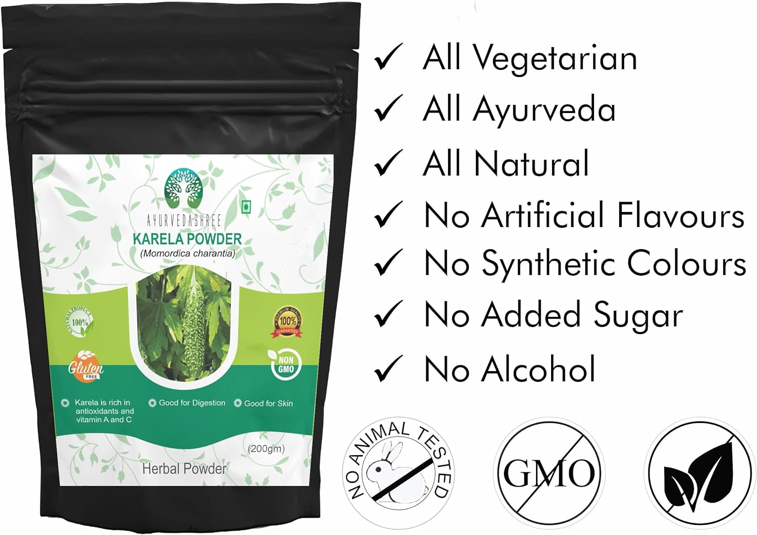 AYURVEDASHREE : Our aim to provide quality products always. We source our raw material from the most natural place of India. Natural with no added chemicals, heavy metals or any other addition which is harmful for anyone in any manner. Our products are made under GMP certified manufacturing. All our products are NON GMO and gluten free. Bitter melon powder supports as blood purifier & de-toxifier, promotes improvement of liver functions. Bitters & Alkaloids present in Bitter melon powder, supports healthy pancreatic cells functions. Bitter melon powder considered to be useful For skin . Lab tested for quality, Non-GMO, vegan & gluten free