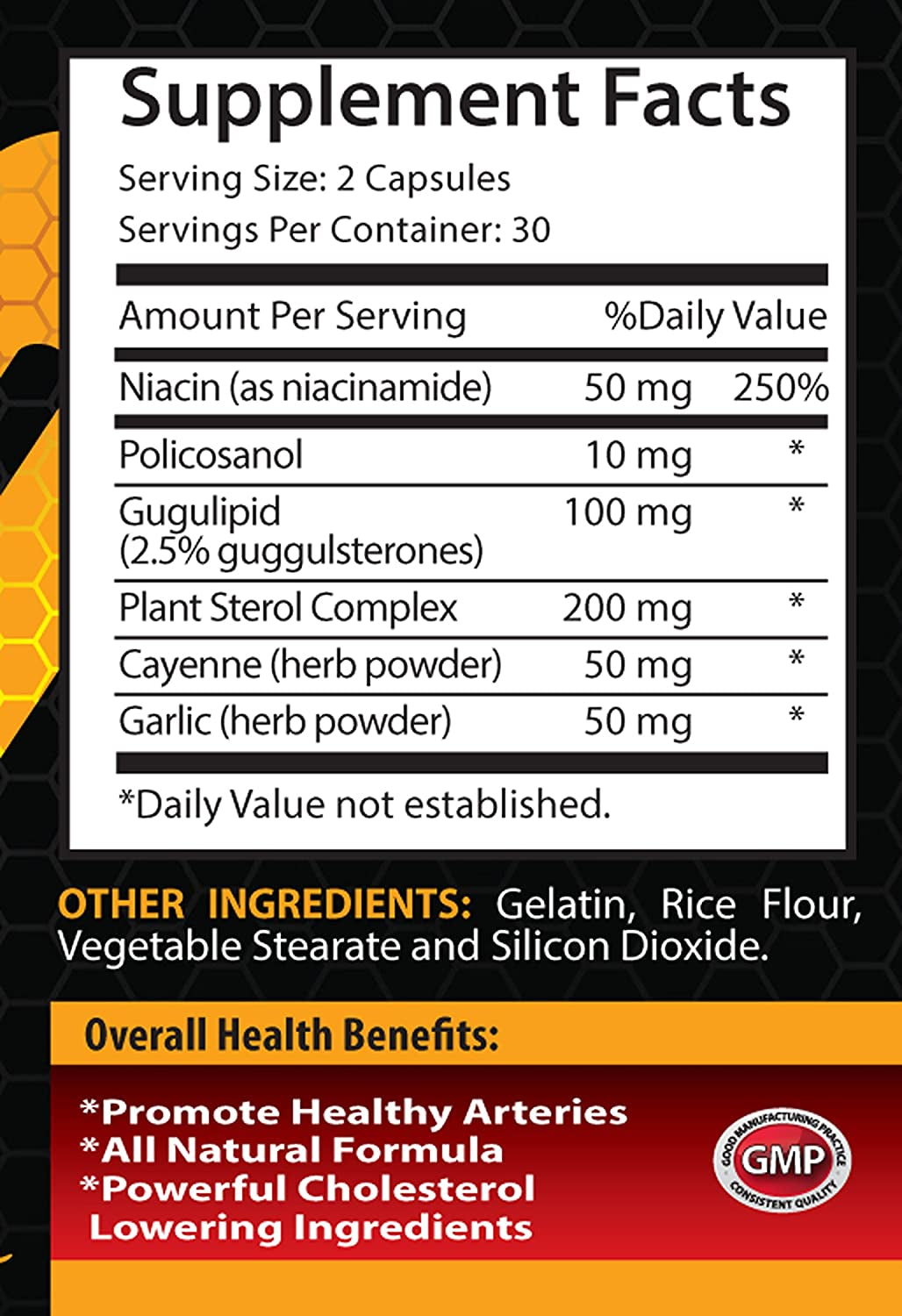 CHOLESTEROL RELIEF: Our all natural formula is a supplement that helps the consumer keep the cholesterol levels under control while also coming with added benefits of the ingredients. The natural ingredients include: Niacin, Policosanol, Gugulipid, Plant Sterol Complex, Cayenne and Garlic Powder.
