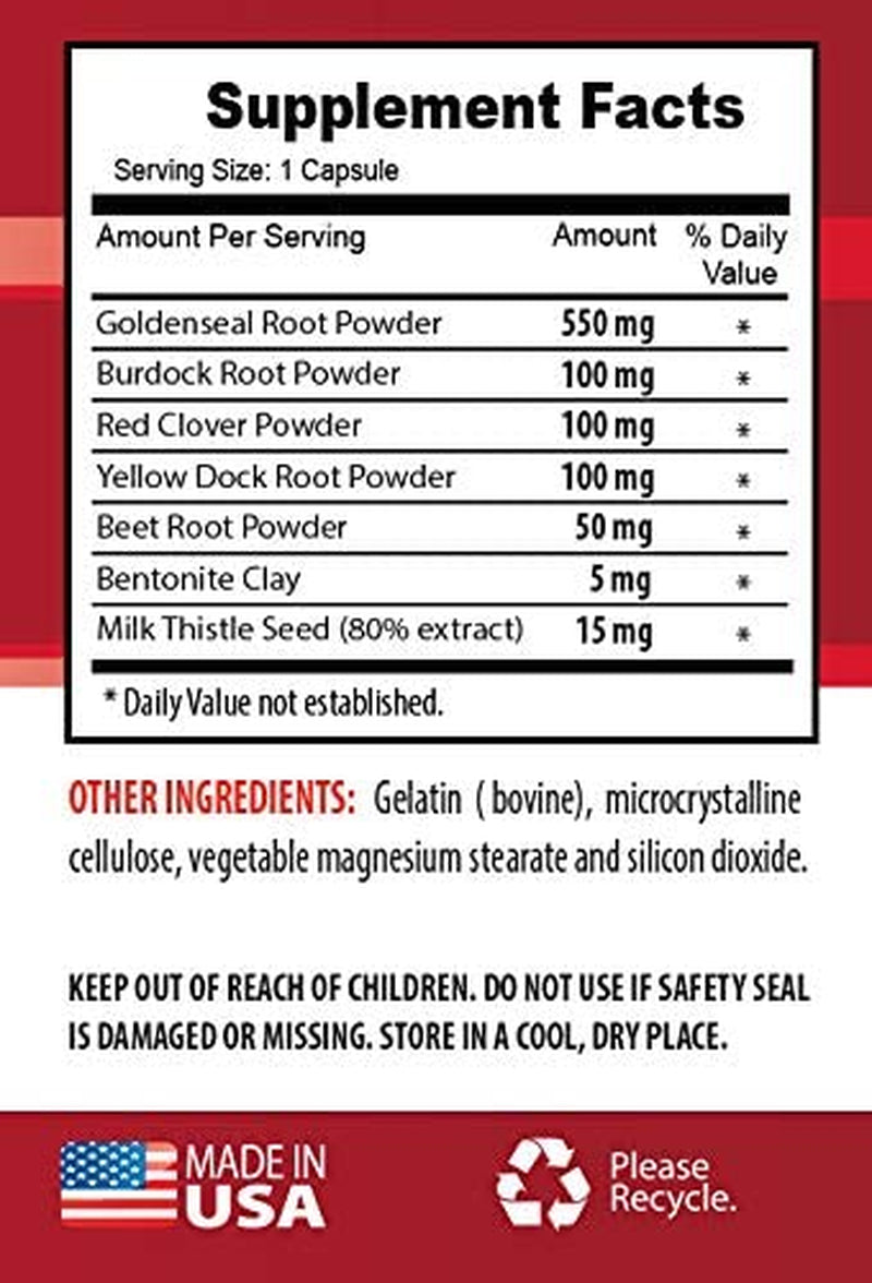 - FULL BODY DETOX AND CLEANSE 920 MG: Is a natural complex can be beneficial for boosting immune system and digestion, support liver and kidney functions, also it have antionxidant properties. This poverful formula contains natural blend from herbs and extracts such as: Goldenseal Root, Burdock Root, Red Clover, Yellow Dock, Beet Root, Bentonine Clay and Milk Thistle Seed (80% extract).