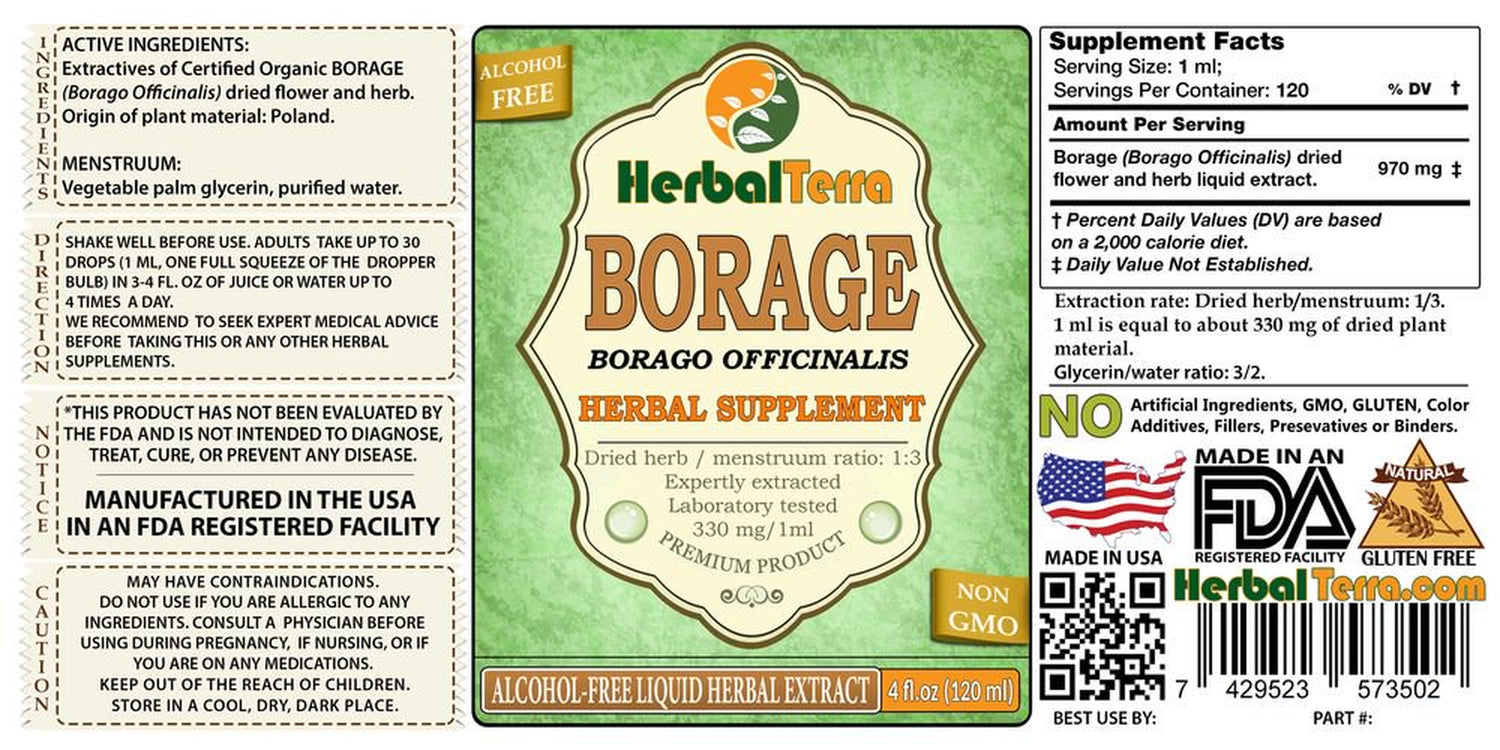 | Product Name | Borage (Borago Officinalis) Glycerite, Organic Dried Flowers and Herb Alcohol-FREE Liquid Extract (Herbal Terra, USA) 2 oz |