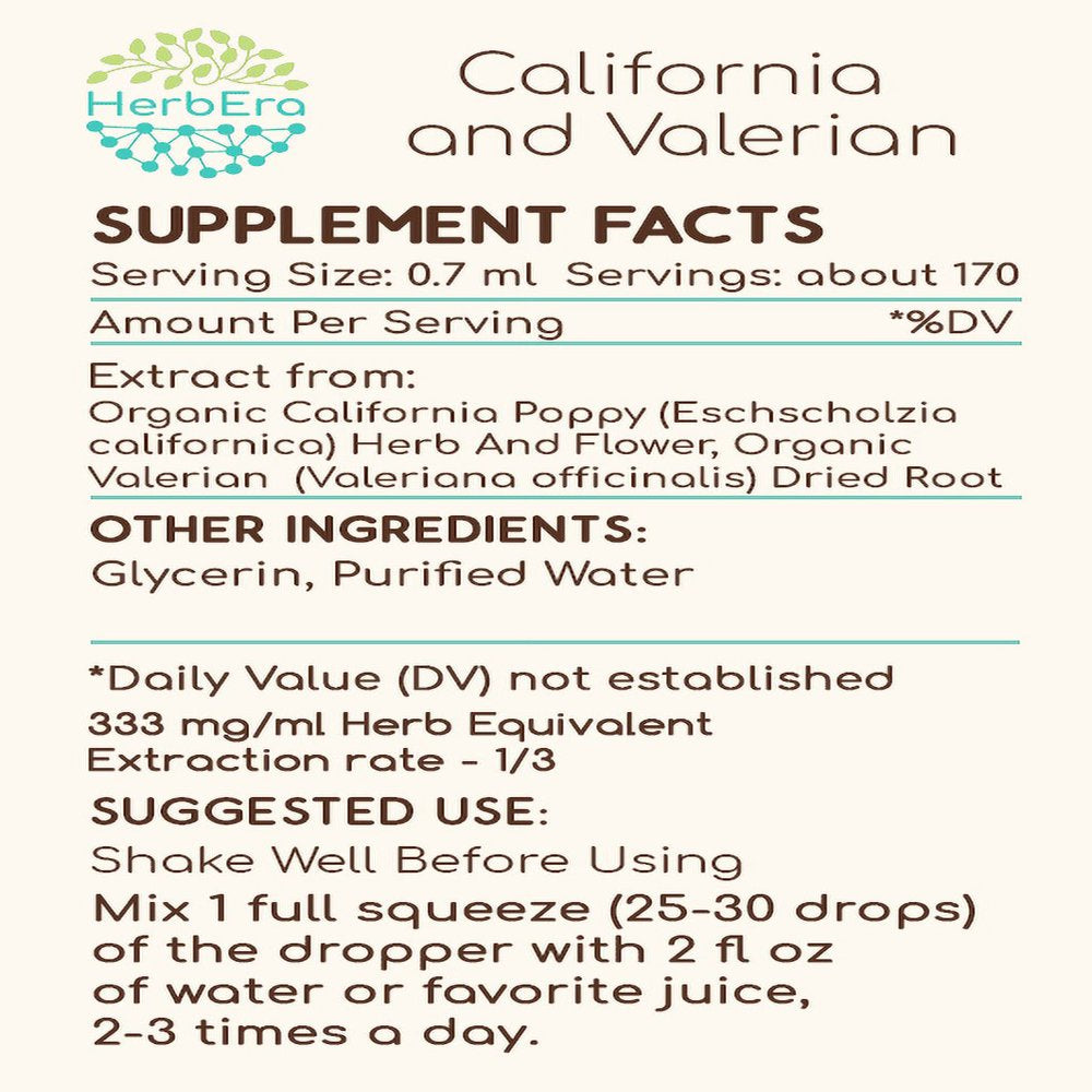 | Product Name | California and Valerian Alcohol-FREE Herbal Extract Tincture, Super-Concentrated Organic (California Poppy Herb And Flower (Eschscholzia Californica), Valerian Root (Valeriana Officinalis)) 2x4 oz |