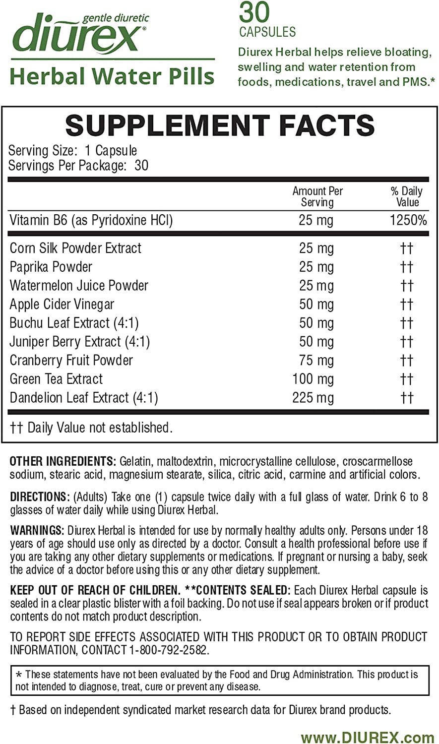 You’re doing all the right things to get rid of periodic water weight like avoiding salty foods and staying active. Now theres a drug-free alternative for whenever you need relief from water bloat. Diurex Herbal water pills are made from ten effective drug-free diuretic ingredients. Foods, medication, hormonal changes and mild edema can all lead to unwanted water retention, and Diurex Herbal water pills are the drug-free way to help you feel better, faster*. *These statements have not been evaluated by the Food and Drug Administration. This product is not intended to diagnose, treat, cure or prevent any disease.
