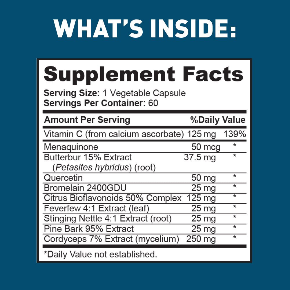 - Formulated for Respiratory Health: Includes Vitamin C, Menaquinone, Butterbur, Quercetin, Bromelain, and a blend of active natural ingredients which support overall health and immune function. (1 Daily Capsule).