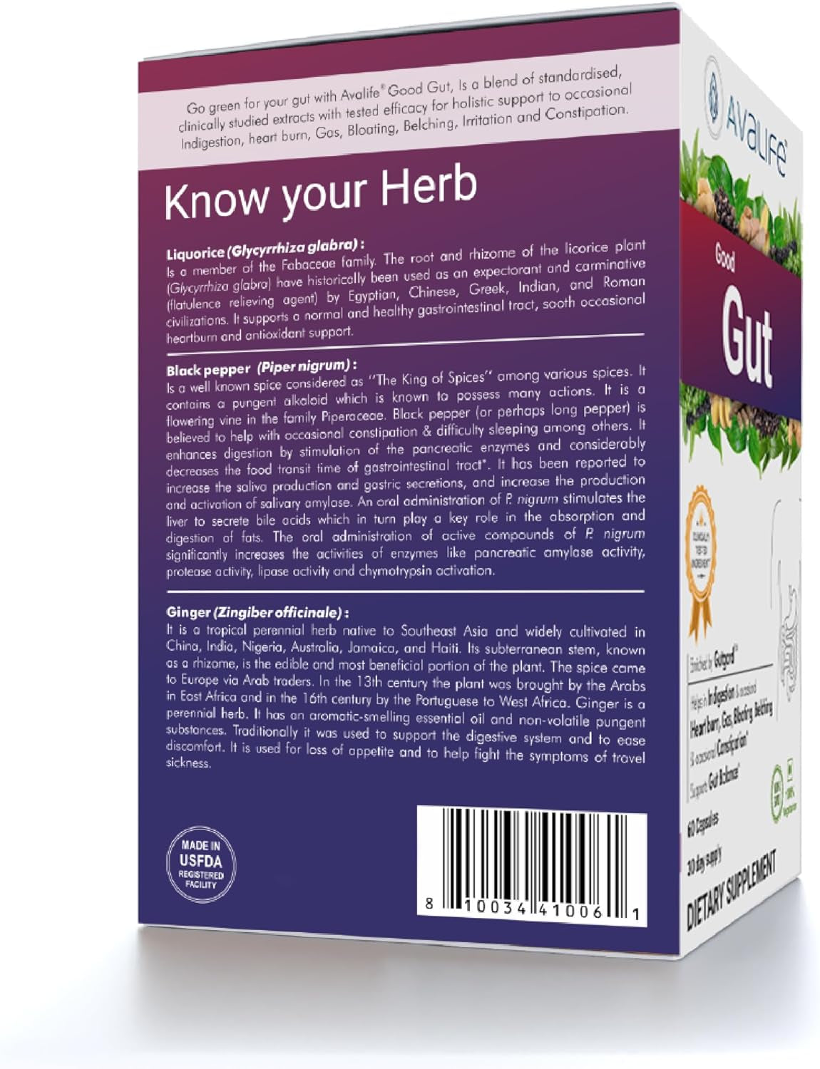 Avalife Good Gut is formulated with a combination of unique, innovative DGL Licorice root extract (Gutgard) and other Ayurvedic herbs to help maintain perfect balance of your gut microbiome.