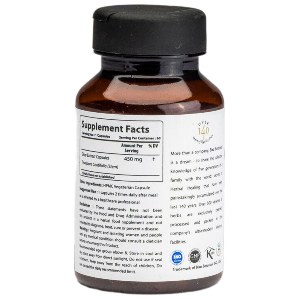 Guduchi Extract Bitters 2.5% Veg Capsule 60 Count (450Mg) (Tinospora Cordifolia/Giloy) | Herbal Supplement for Sugar Control |Best Immunity Modulator & Blood Purifier| Bixa Botanical is backordered and will ship as soon as it is back in stock.