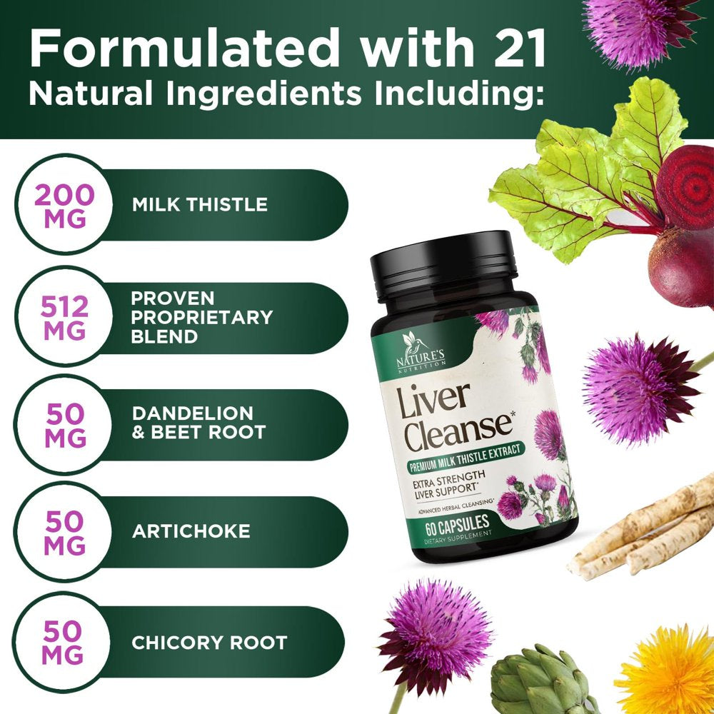Revitalize & Cleanse Your Body As the saying goes, "When you take care of your body... ...Your body takes care of you Your body is designed for health. Your cells express themselves through chemical reactions instead of words. If you body is telling you that it needs a change, revitalize and cleanse it from the inside out with Nature's Nutrition supplements. Our Liver Cleanse product contains a premium formula with 21 herbs packed into easy to take capsules. Our 1104 mg, 2 capsule daily serving is packed with Milk Thistle - A 200mg "Powerhouse" of plant compounds known as silymarin which support your liver. Beet Root - Don't confuse our beet root with white sugar beets used for extracting sugar and sweetening processed substances. Our beet root is genetically and nutritionally different. It contains folate (vitamin B9) which plays a key role in supporting the liver. Artichoke Extract - Artichoke extract contains fiber, vitamins, minerals, and antioxidants. Get the health benefits of the artichoke plant without having to deal with the mess. Dandelion - While annoying for gardeners, dandelion plants can be an important part of your daily routine. They support the liver's ability to filter. Chicory Root - Another plant that comes from the dandelion family, Chicory root is high in Inulin, a type of fiber that acts as a prebiotic. Jujube Fruit Extract - Also known as "Chinese date," jujube fruits are rich in several antioxidant compounds and vitamins. 21 Herbs Total: Top quality ingredients to support liver health.