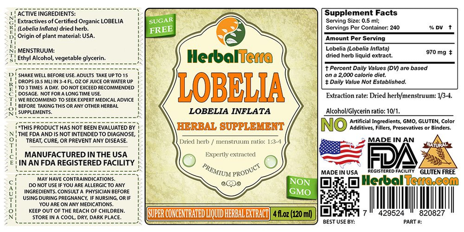 Main ingredient: Certified Organic Lobelia (Lobelia Inflata) Dry Herb. Origin of plant material: USA. Menstruum: Alcohol, vegetable palm glycerin, crystal clear water. Contains NO: GMO, gluten, artificial colors, heavy metals, preservatives, pesticides, fertilizers.