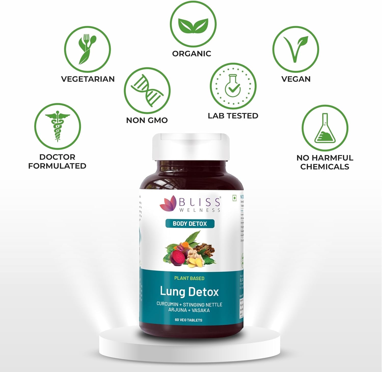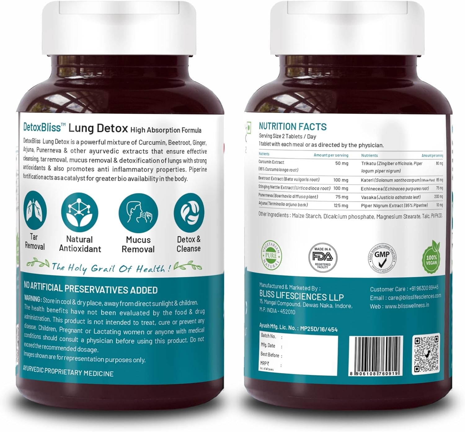 Bliss Welness Lung Detox Supplement is an Ayurvedic Combo supplement of Curcumin, Stinging Nettle, Arjuna, Vasaka, Beetroot, Ginger, Trikatu, Katerim Echinecea and Piperine. This Detox combo is highly befeficial for lung detoxification and cleansing. It helps remove Tar and Mucus from the lungs and aids Lung Health of Smokers.