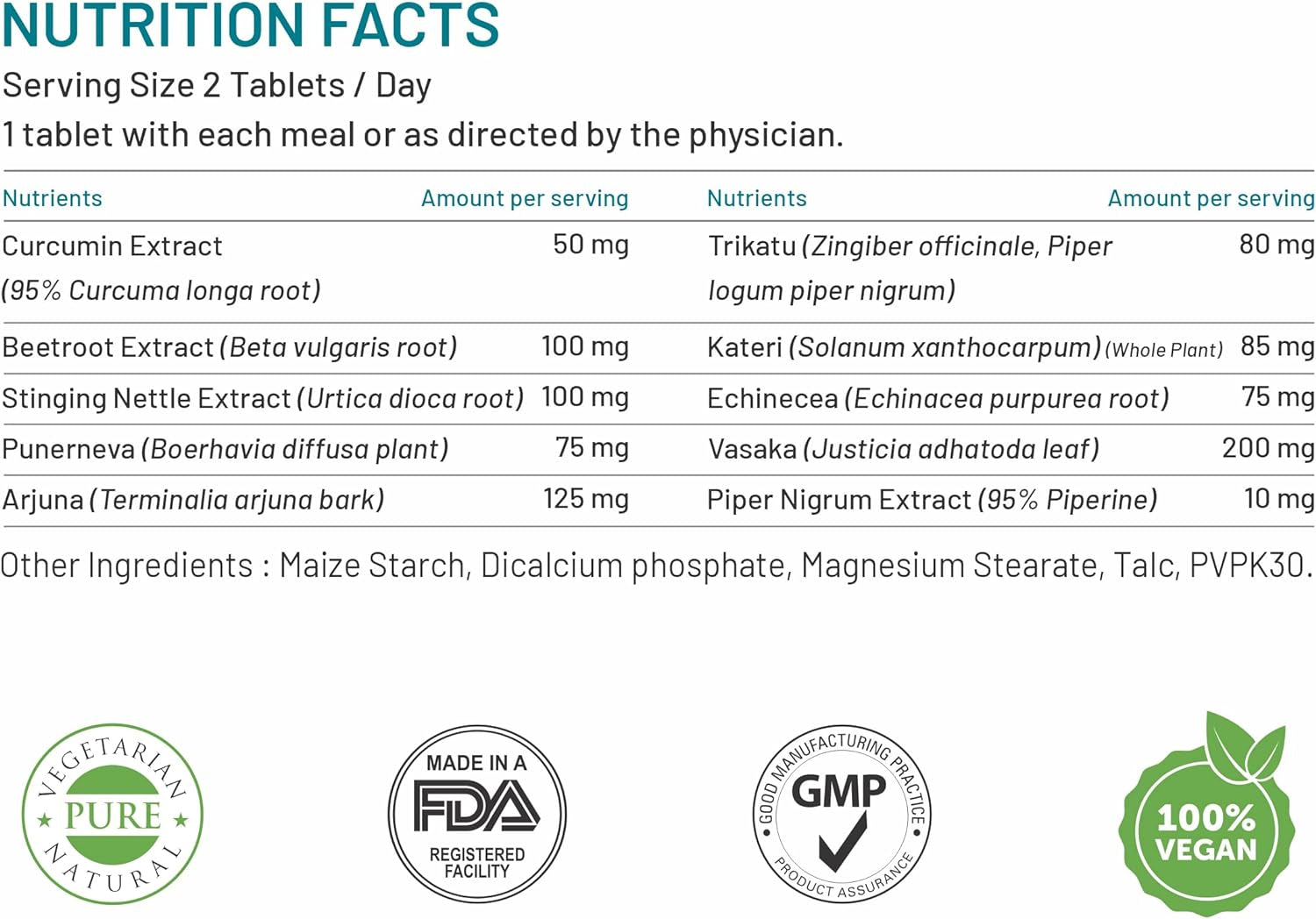 - Ayurvedic Lung Cleanse Combo : Highly Potent Combo Of Curcumin 50Mg Beetroot Extract 100Mg Stinging Nettle 100Mg Ginger 50Mg Punerneva 75Mg Arjuna 125Mg Trikatu 80Mg Kateri 85Mg Echinecea 75Mg Vasaka 200Mg Piperine 10Mg.