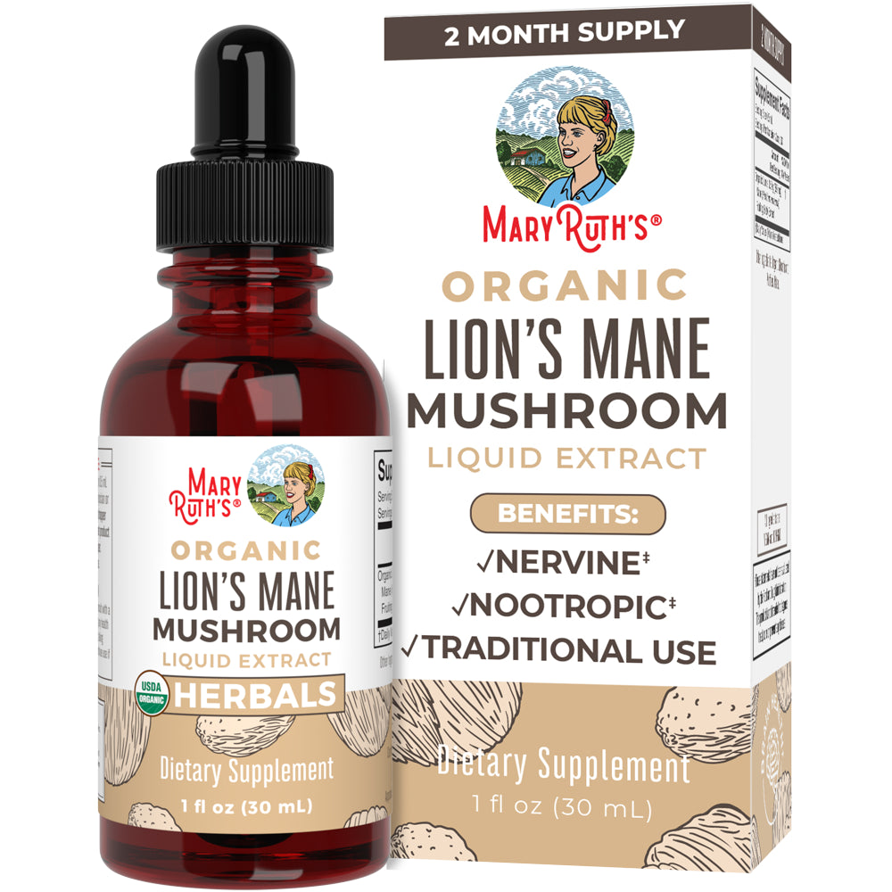 Support your brain health with MaryRuth's USDA Organic Lions Mane Mushroom liquid drops. traditional mushroom. With nervine and nootropic properties, this botanical may support your cognitive health. Long used in Traditional Chinese Medicine (TCM), the edible Lion's Mane (Hericium erinaceus) Mushroom is known for its brain health properties. Its nervine and nootropic properties support cognitive health. Though this mushroom is still being studied to determine its further potential, you may want to try this tincture to experience the great benefits of lion’s mane for yourself — both those benefits we know about, and those we’re just learning about. For Most lifestyles: Free of Common Allergens, USDA Organic, Non-GMO, Vegan, Made in a GMP Facility. Dairy Free, Nut Free, Gluten Free, Soy Free, Sugar Free, No Synthetic or Artificial Colors, Alcohol Free Tincture. B Corp Certified. Vegan. Unisex