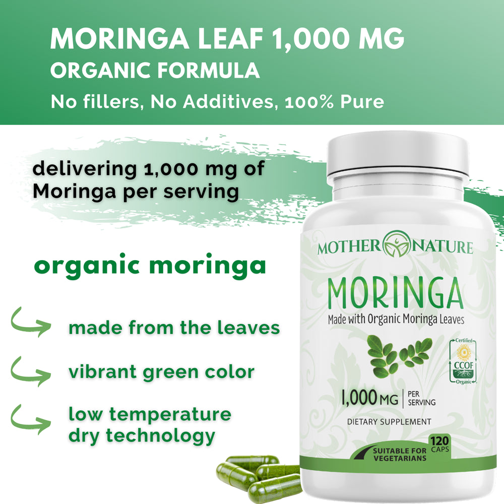 • ๐ŸŒฟ PREMIUM MORINGA CAPSULES: Elevate your health with Moringa Supplements 1000mg from Mother Nature Organics. Crafted from 100% Organic Moringa Powder, these capsules embody nature's vitality. Vegan, non-GMO, and free from additives, they encapsulate pure goodness. Enriched with nutrients, essential minerals (magnesium, calcium, iron), and vitamins A, B, C, these capsules empower healthy living. Incorporate 2 daily pills into your routine for an invigorating energy boost!