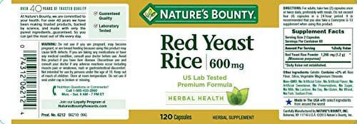 Nature'S Bounty Red Yeast Rice Pills and Herbal Health Supplement, Dietary Additive, 600Mg, 120 Capsules 120 Count (Pack of 1)