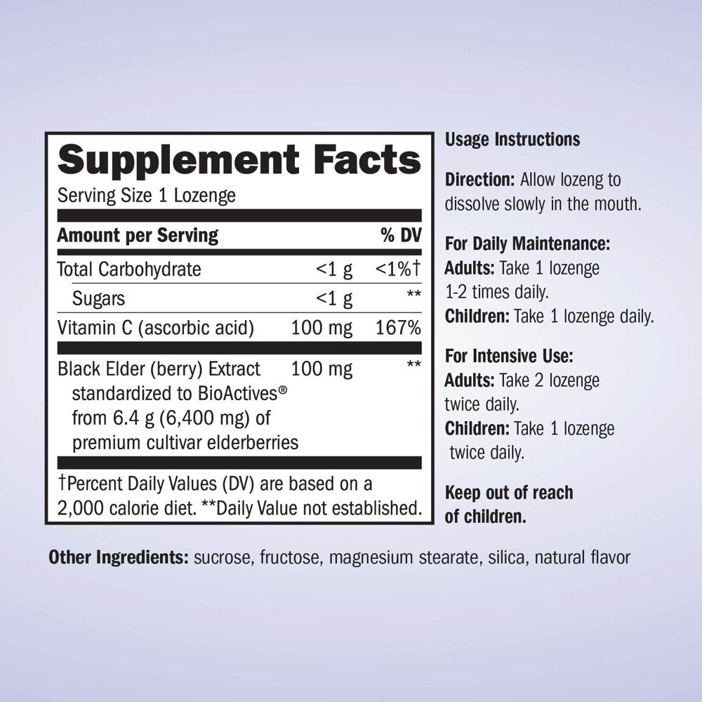 - TRIPLE ACTION IMMUNE BLEND*: Sambucus elderberry lozenges are made from European black elder (Sambucus nigra L.) has been traditionally used as a winter remedy for immune support.* Made with our unique, full spectrum black elderberry extract, ensuring Flavonoid BioActives content, which has been tested and shown to be active within the body.