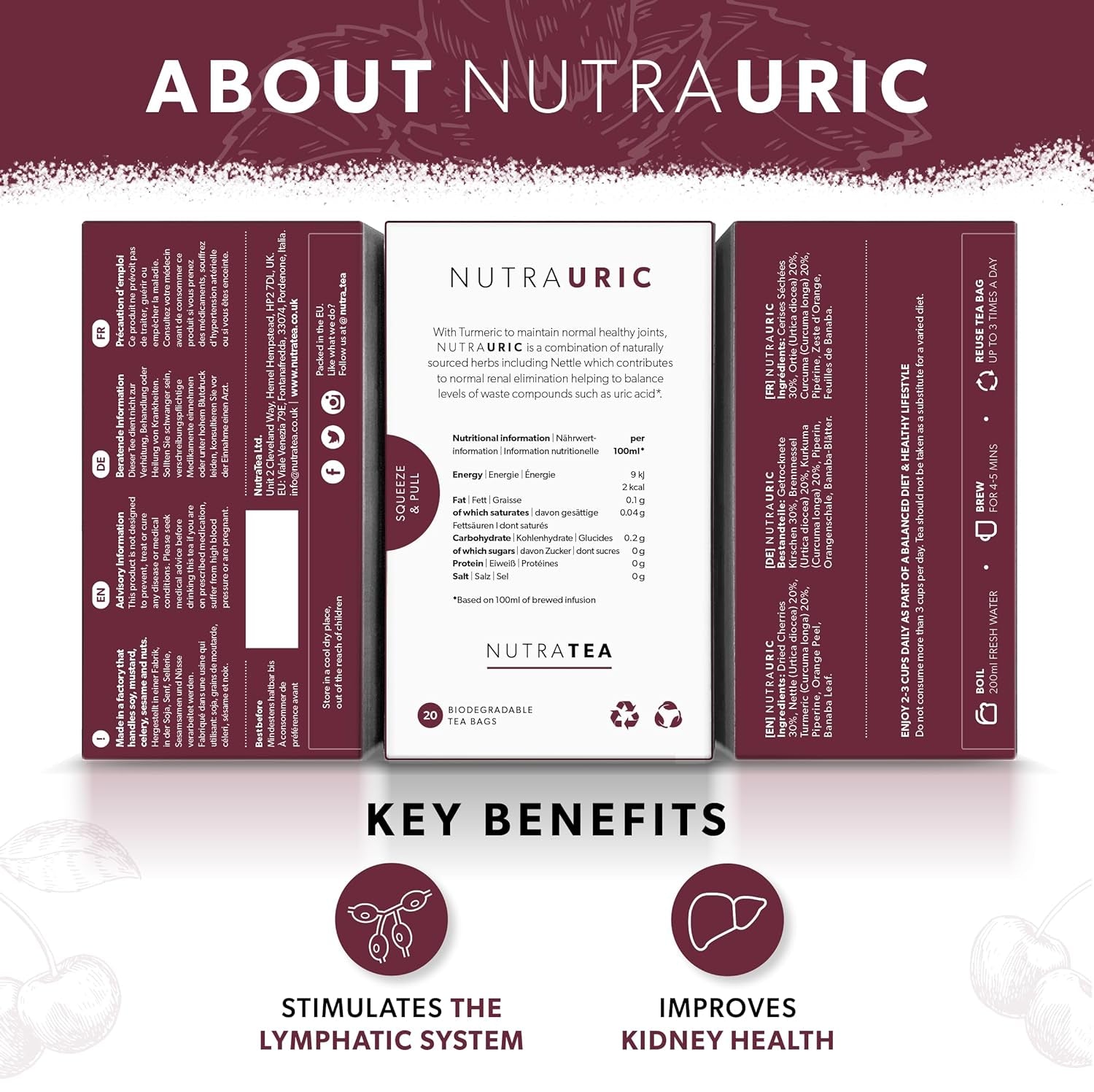 NUTRAURIC - Uric Acid Cleanse and Kidney Support – Kidney Cleanse Tea – Includes Cherry, Nettle & Turmeric - 20 Enveloped Tea Bags - by Nutra Tea - Herbal Tea
