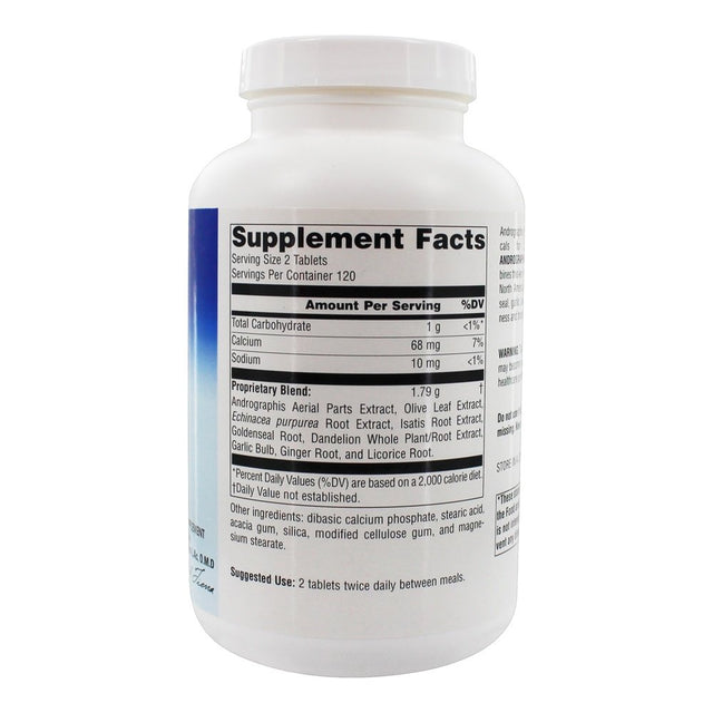 Andrographis Respiratory Wellness by Planetary Herbals 240 Tablet Andrographis Respiratory Wellness 240 Tablet Andrographis is one of the most widely used botanicals for promoting healthy respiration. Andrographis Respiratory Wellness combines this key botanical with the primary European and North American herbs including echinacea goldenseal garlic and olive leaf for supporting winter wellness and broad spectrum immune support. Suggested Use As a dietary supplement 2 tablets twice daily between meals. - Or as directed by your healthcare professional. Supplement Facts Amount Per Serving Daily Value Calories 5 Calcium 68 mg Sodium 10 mg Proprietary Blend Andrographis Aerial Parts Extract Echinacea purpurea and Echinacea pallida Root Extract Olive Leaf Extract Isatis Root Extract Goldenseal Root Dandelion Root Extract Garlic Clove Ginger Root and Licorice Root. 1.89 g Percent Daily Values are based on a 2 000 calorie diet Other Ingredients dibasic calcium phosphate stearic acid acacia g