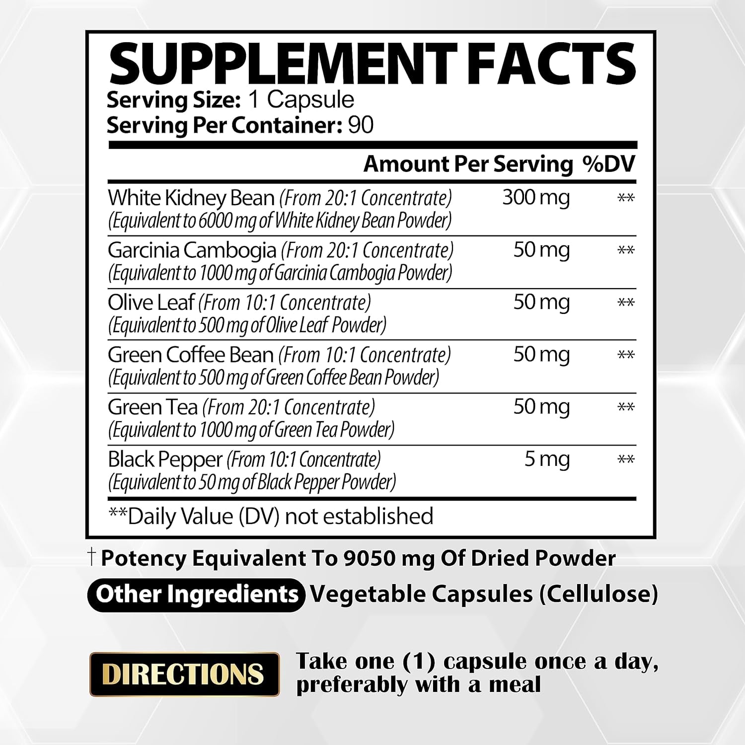 - ✅ Wellbeing Supported by a strong combination of 6 herbs, rich in fiber and carb control such as White Kidney Bean, Garcinia Cambogia, Olive Leaf, Green Coffee Bean, Green Tea, and Black Pepper.