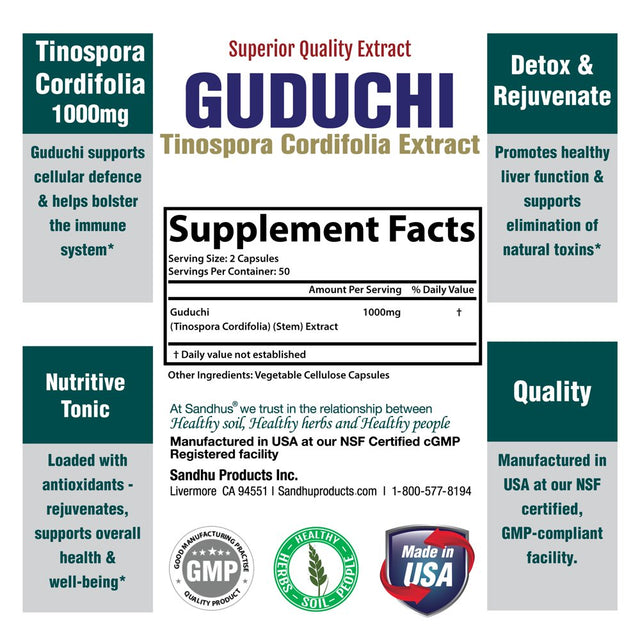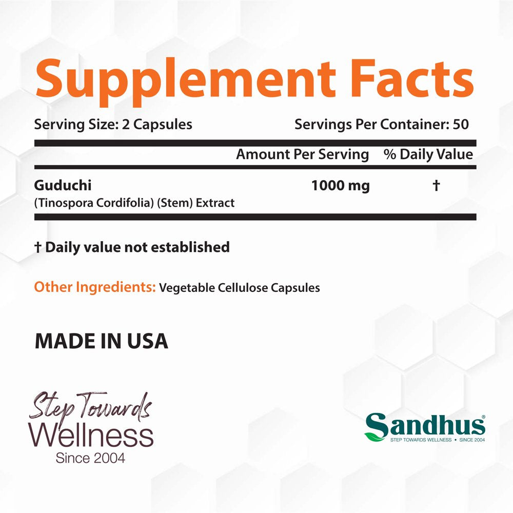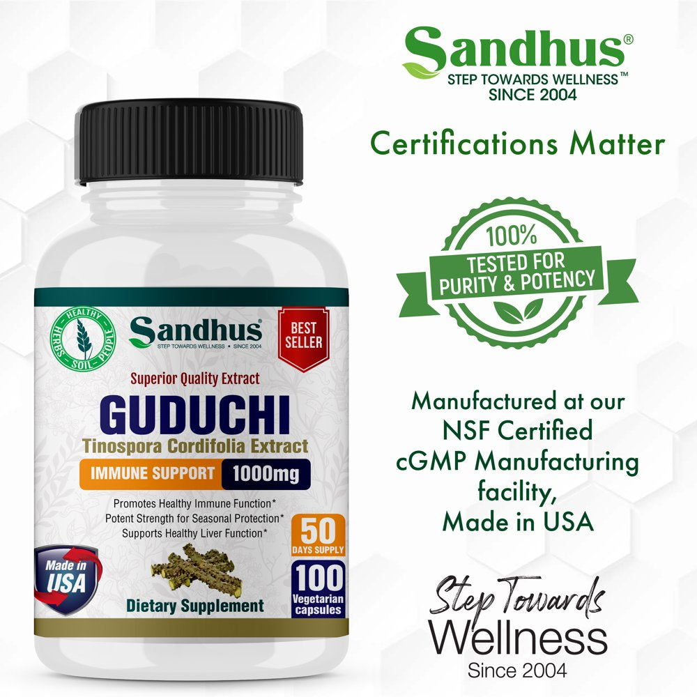 Sandhu'S Guduchi 1000Mg, Herbal Supplement for Immune & Liver Health, Offers 100 Veggie Capsules