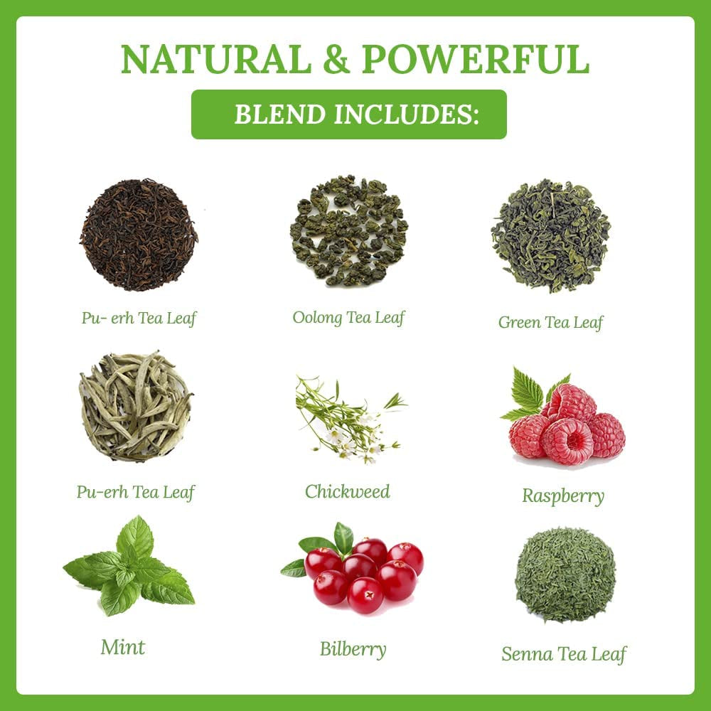 - EFFECTIVE BLEND which includes natural Green Tea, White Tea, Pu’erh Tea, Oolong Tea, Bilberry Tea, Peppermint Tea and more.