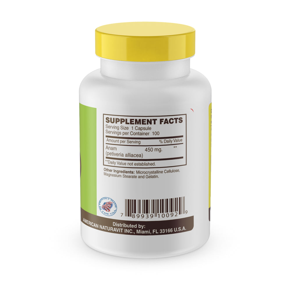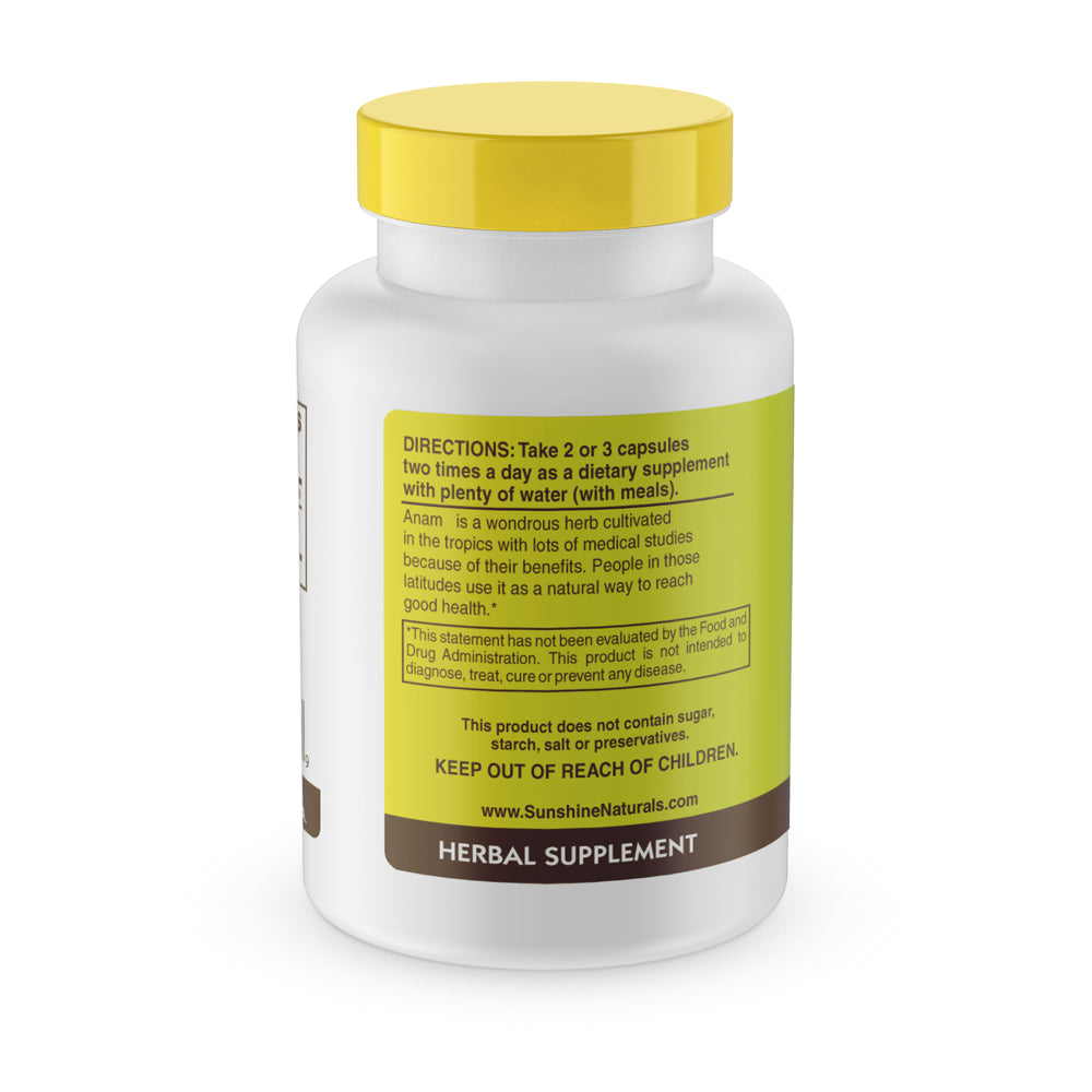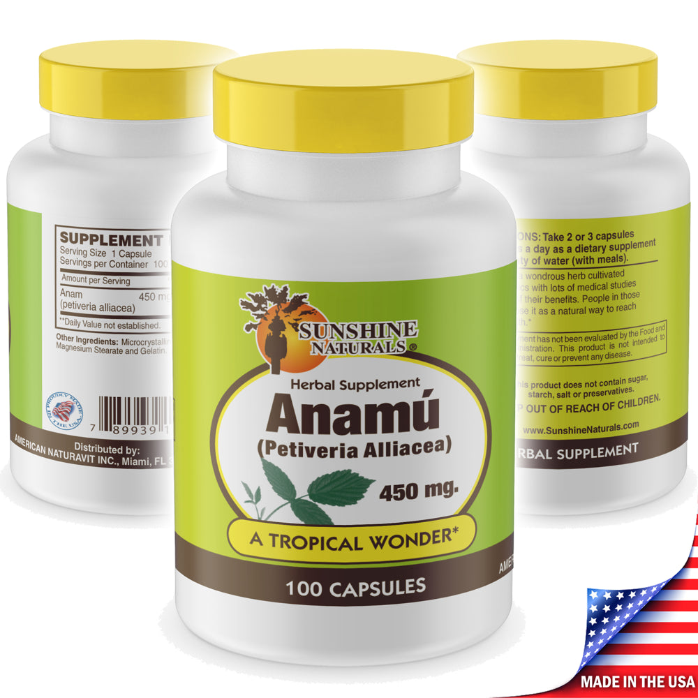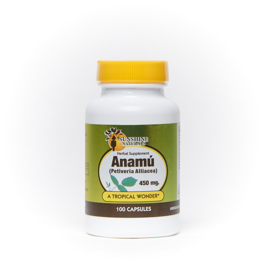 Sunshine Naturals Anamu 450 mg Capsules, Herbal Dietary Supplement, 100 ct. Anamu is a wondrous herb cultivated in the tropics. Recent research shows that anamu has good potential as an immune tonic or stimulant, and it can also help the structural system, particularly the joints.