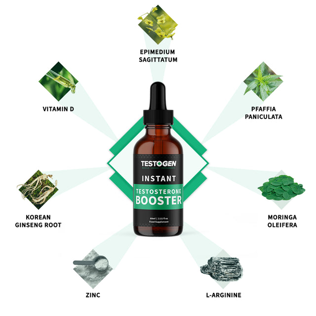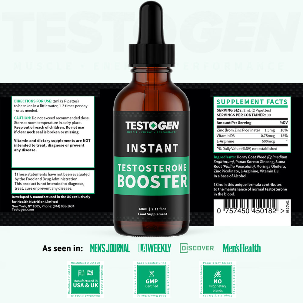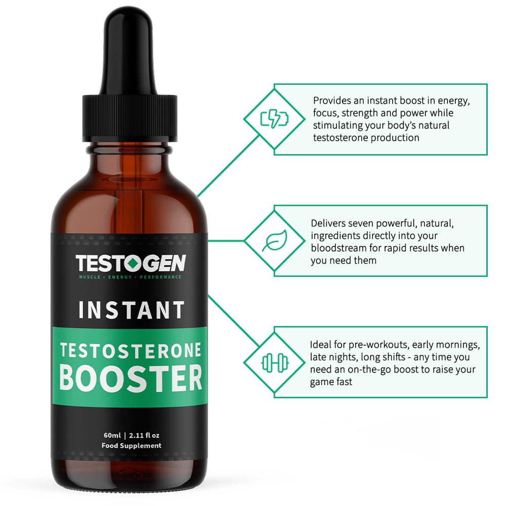 Get an instant Testosterone & energy boost whenever you need it with Testogen Instant Booster Drops. Designed to deliver fast acting T-level support, Testogen drops feature a unique liquid delivery system to provide an on-the-go energy boost and long term T-level support. INSTANT DELIVERY & MAXIMUM BIOAVAILABILITY - The liquid formula lets your body directly absorb the active ingredients into the bloodstream, giving you the maximum testosterone boosting kick BECOME MORE FOCUSED - Get your edge back at the gym and break through frustrating plateaus. Perfect for pre-workouts, early mornings or late night shifts GET STRONGER - Testogen Booster Drops stimulate your body’s natural testosterone production meaning more muscle and power FEEL HEALTHIER - Helps you to burn stubborn body fat and start reducing your gut! SHARPEN FOCUS - Fee laser focused and eliminate brain fog any time of the day or night with the simple, quick liquid delivery system