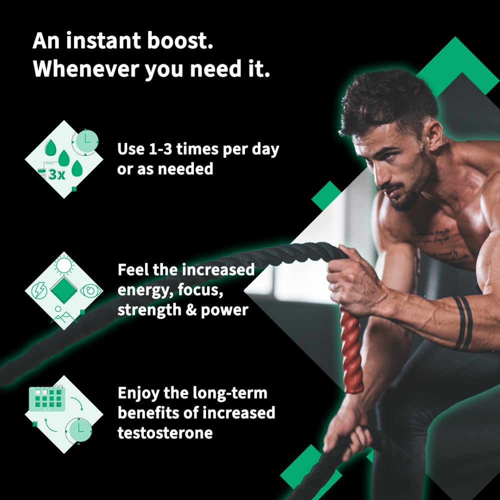 Use Testogen Instant Booster Drops before your workouts to naturally enhance your strength, power and concentration, thanks to the fast-release formula they’re ready to go when you are. The liquid drops, taken orally allow for direct absorption into the body, immediately releasing a rush of ingredients and delivering an energy kick that you can actually feel.