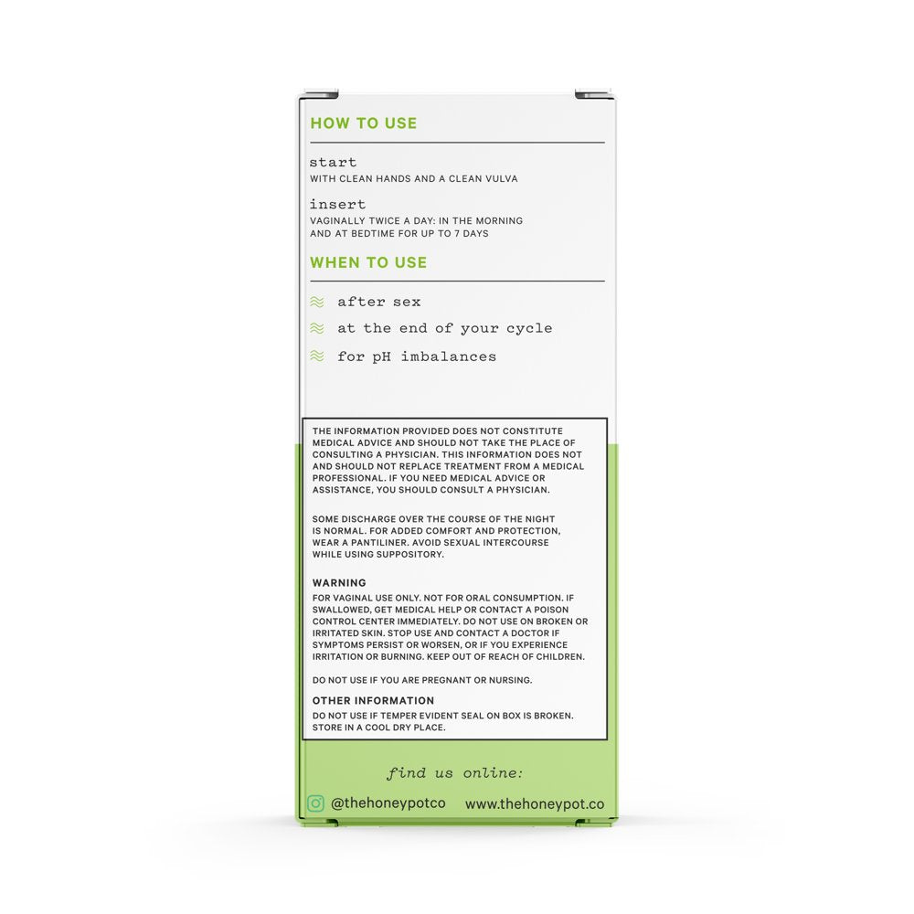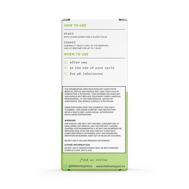 The best time to use the suppositories are after sex, at the end of your cycle, or anytime your pH is imbalanced. The Honey Pot’s Boric Acid Suppositories are clinically tested and shown to minimize odor, hydrate and moisturize. For vaginal use only and not for consumption.