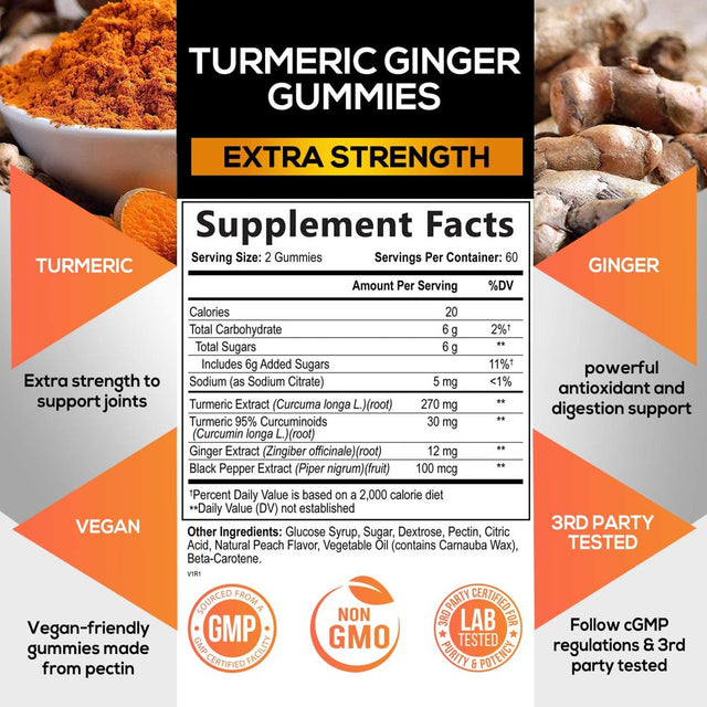 - Extra Strength Turmeric & Ginger Gummies: Our premium T3 Turmeric Curcumin Complex; with 95% standardized curcuminoids; and enhanced with Black Pepper and Ginger to provide maximum absorption and bio-availability