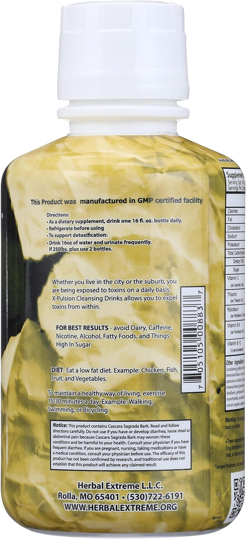 Whether you live in the city or the suburb, you are being exposed to toxins on a daily basis. X-Pulsion Instant Cleansing Drinks allow you to expel toxins from within. Benefits of using X-Pulsion 16 oz Passion Splash Berry and Twisted Lemonade: Strips unwanted toxins from the urinary tract for up to 8 hours Taste Great Easy to use Directions: As a dietary supplement, drink one 16 fl oz. bottle daily. Refrigerate before using. To support detoxification, drink 16 oz of water and urinate 4 times. Sample mid stream on the 5th or after. If you weigh 250 lbs. or more drink 2 bottles. For Best Results avoid the following: Dairy Caffeine Nicotine Alcohol Fatty Foods Things high in sugar Diet: Eat a low fat diet. Example: (Chicken, Fish, Fruits, & Vegetables) Exercise: To maintain a healthy way of living, exercise 15-30 minutes daily. Example: Walking Swimming Bicycling