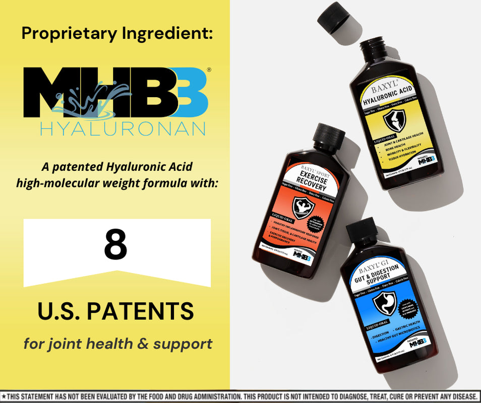 Baxyl® Joint Relief delivers patented and proven ingredients to support & promote joint, bone, skin and eye health. Baxyl® is a natural hyaluronic acid supplement that is bioidentical to the hyaluronic acid naturally produced by the body. It is unique to other hyaluronic acid supplements on the market due to its oral liquid formulation which allows for quick absorption and maximum efficacy. Baxyl® products are made from our FDA-regulated, proprietary hyaluronic acid formula (MHB3®) - and are trusted by chiropractors, physical therapists, and doctors as a long-term solution for joint discomfort. Taken twice daily, patients began noticing relief in only weeks! MHB3® Hyaluronan has been scientifically proven to be bioavailable, absorbed, efficacious, and safe. It confers greater and more consistent results than any other product in both short- and long-term care. MHB3 has been awarded eight U.S. Patents and is highly researched to be efficacious, allowing for best results (Hefner, 2012). Research Proven Benefits: o Alleviates joint discomfort o Improves joint mobility & flexibility o Supports a healthy inflammatory response o Naturally restores joint tissues & cartilage o Supports vertebrae and spine health o Enhances skin and eye health o Supports healthy bone formation o Promotes tissue hydration