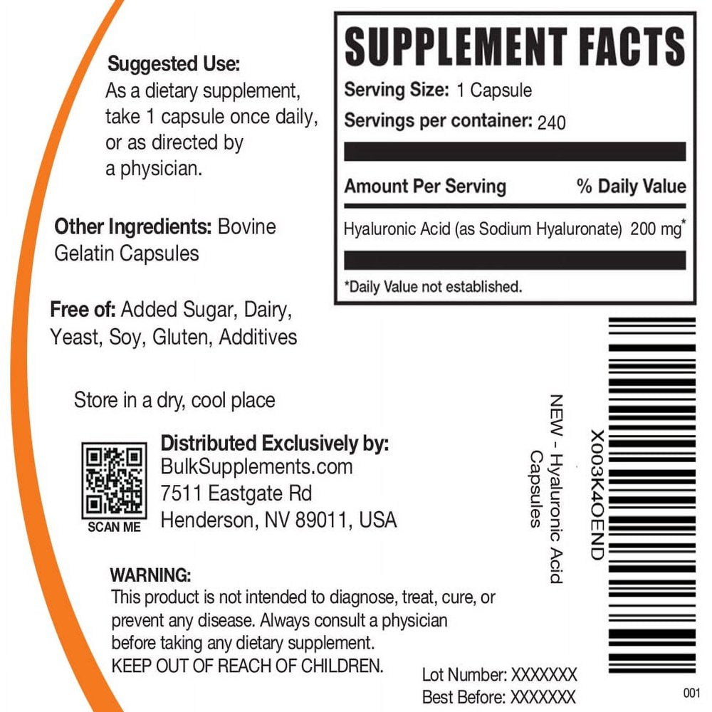 Bulksupplements.Com Hyaluronic Acid Capsules, 200Mg - Joint Supplements - Pure Hyaluronic Acid (240 Gel Capsules - 240 Servings)