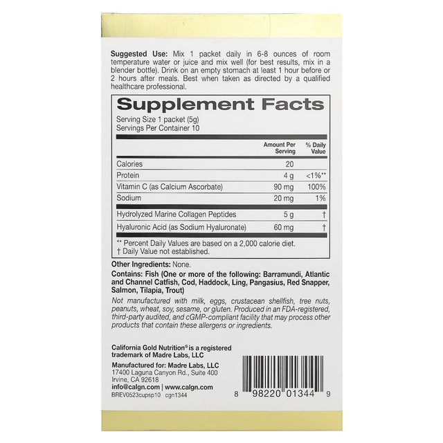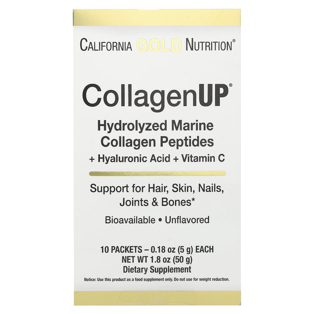 Collagen, hyaluronic acid, and vitamin C all contribute to the health and wellbeing of the musculoskeletal system. California Gold Nutrition® CollagenUP contains all three of these ingredients to help support healthy hair, skin, nails, joints, and bones.* The unflavored powder comes in single-serving packets to provide a convenient way for you to take them on the go and quickly mix with your favorite drink. Easy to Use On-the-Go Single Serve Packets Marine Sourced Collagen Peptides + Hyaluronic Acid + Vitamin C Enzymatically Hydrolyzed Collagen Broken Down into Bioavailable Peptides iTested Verified