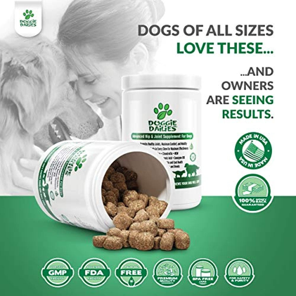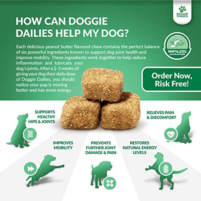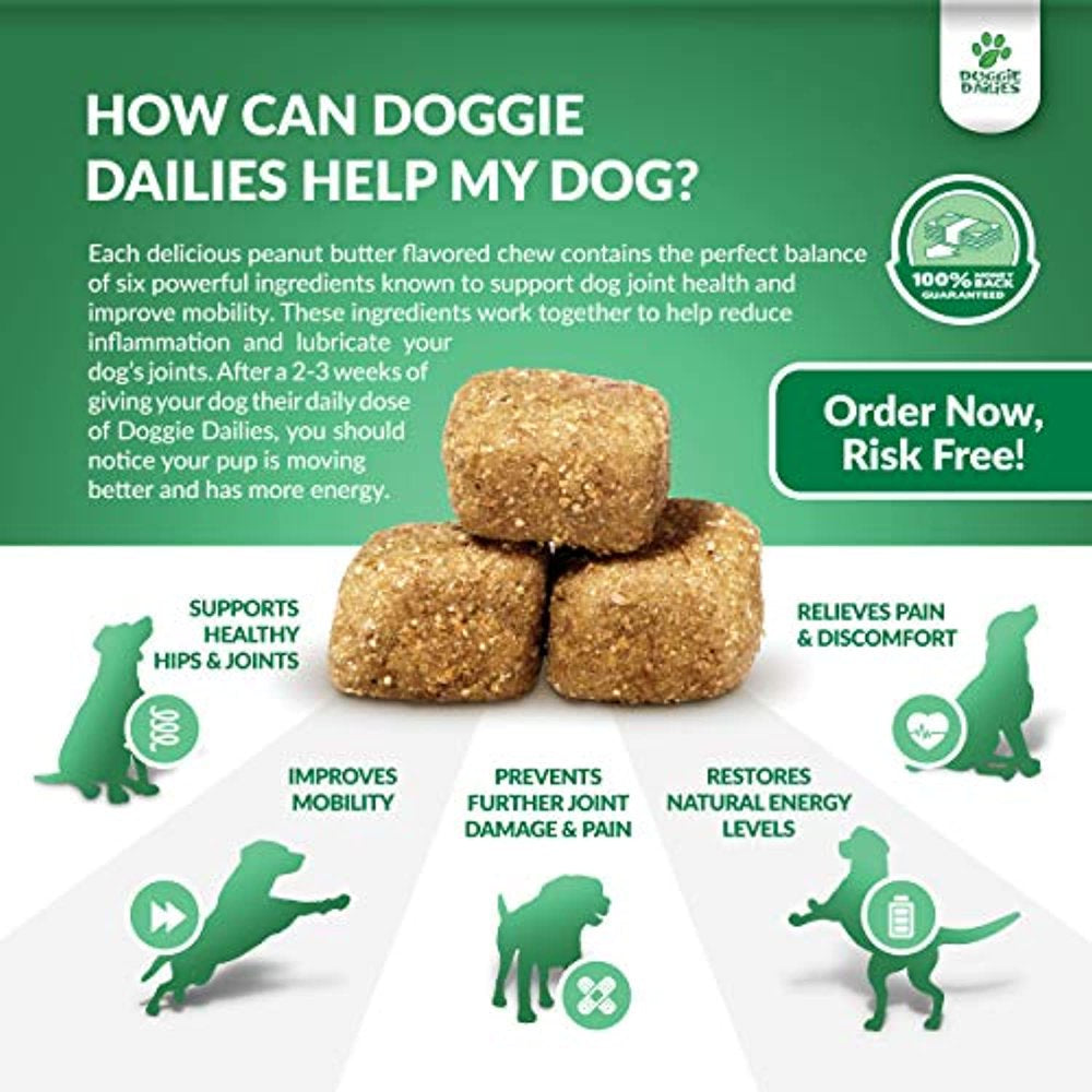 - Help Put The Pep Back In Your Pup's Step With A Tasty Peanut Butter Treat They'll Love: Doggie Dailies offers safe and effective hip and joint chews for dogs of all breeds, ages, and sizes; Our formula may help lubricate joints, and maintain cartilage and connective tissue; A daily dose of our dog glucosamine can help maintain your pup’s energy levels, mobility and overall joint health