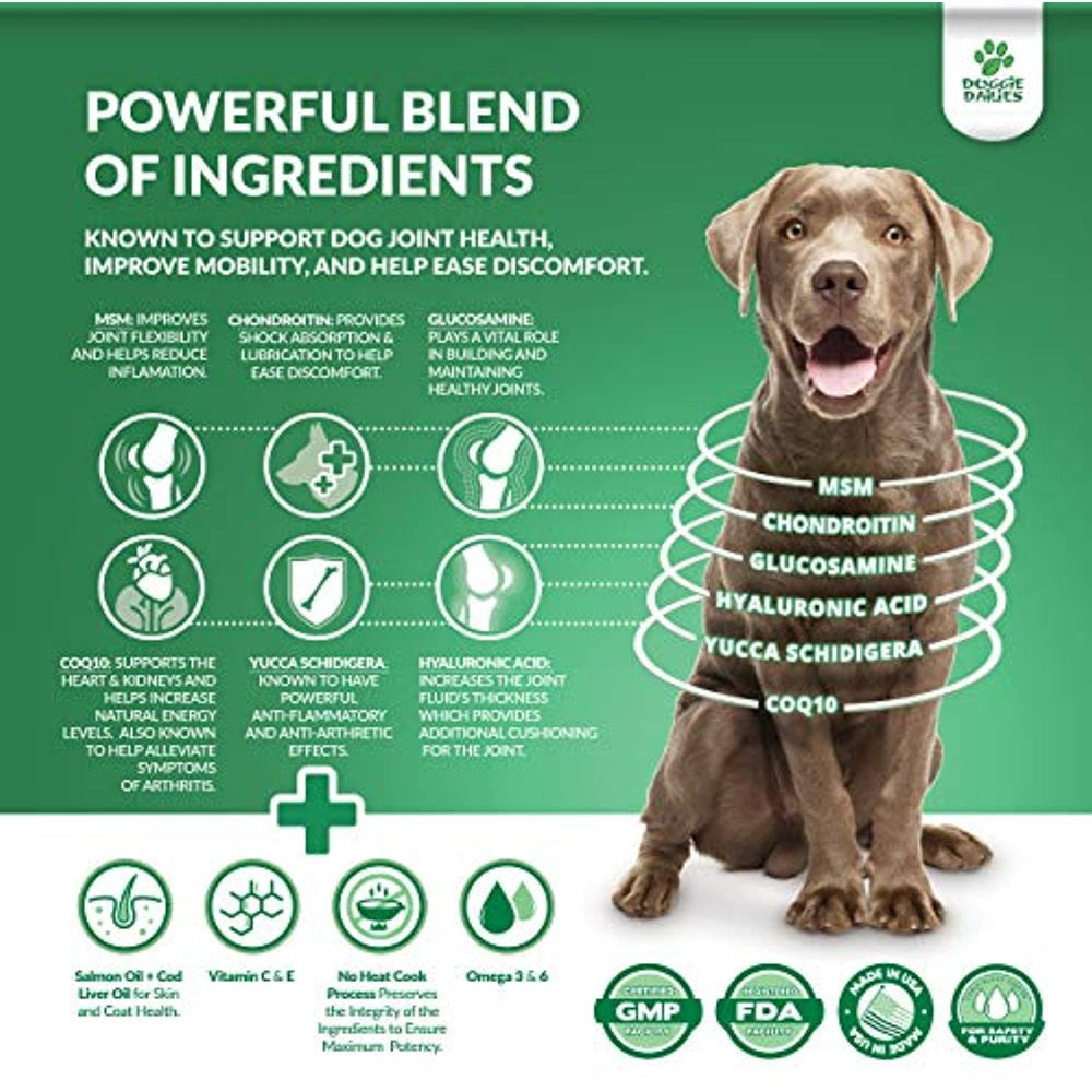 - Powerful Blend of Ingredients Known to Support Dog Joint Health, Mobility, and May Help Discomfort Associated With Normal Daily Activity: Supporting your dog's joint health is important, our soft dog treats make that easy; Every soft chew is loaded with Glucosamine HCl, Chondroitin, MSM, Yucca Schidigera, CoQ10 (coenzyme q10), and Hyaluronic Acid (HA); Plus Omega 3 & 6, Vitamin C & E, and Salmon Oil & Cod Liver Oil for skin and coat health