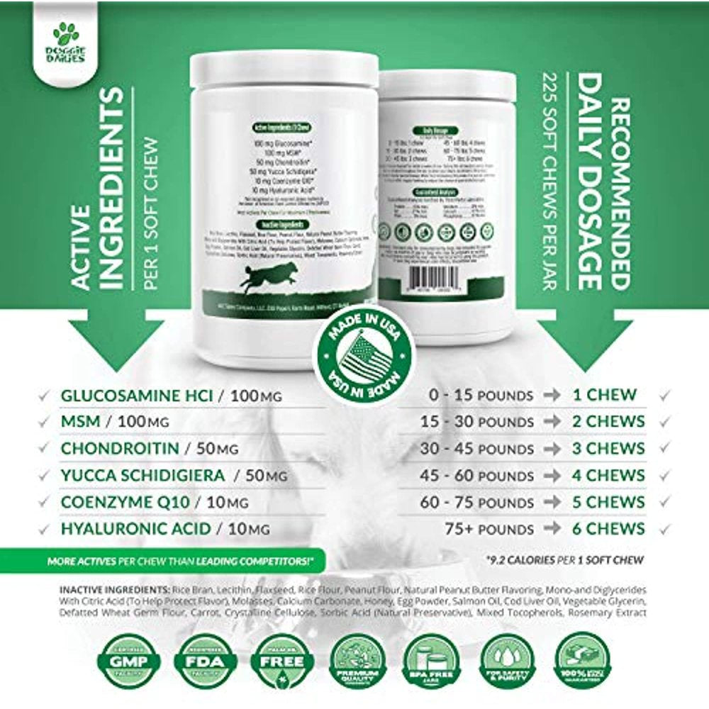 - 225 Soft Chews, Ingredients You Can Trust, Taste Your Dog Will Love: We've carefully crafted a delicious joint supplement for dogs that helps provide ingredients that your dog needs for maintaining hip and joint health and normal activity levels; Our peanut butter flavored hip and joint dog treats are easy to give and so delicious your dog will be begging for more