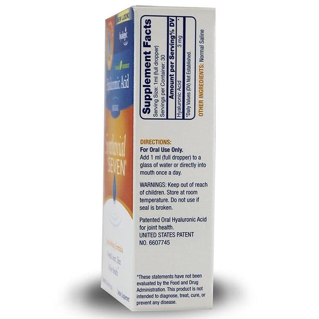 Synthovial Seven® Oral Hyaluronic AcidPatented for overall joint healthUse our patented oral Synthovial Seven® to supplement your body's HA supply on the inside, and apply our new patented HylaRub to the outside and help maintain healthy joints and normal mobility.Hyaluronic Acid (HA) exists naturally in all living organisms. In the body, it is found in greater concentrations in the synovial fluid of joints for lubrication, the vitreous humor (fluid) of the eye and most abundantly in the skin.As we age, the body produces less and less Hyaluronic Acid. This has an effect on normal, smooth, comfortable joint movement and normal softness and smoothness of the skin. You can maintain normal mobility, proper skin condition, the skin's self-smoothing ability, and clear healthy eyes with Synthovial Seven®.Synthovial Seven® is an oral solution made from premium grade Hyaluronic Acid with high molecular weight. Hyaluronic Acid is a polymer and it can come in varying molecular weights. Studies have shown more benefits with the higher molecular weight HA polymers.Synthovial Seven® is a liquid solution of Hyaluronic Acid. Oral solutions by nature are absorbed by the body easier and quicker than tablets and capsules.It's Easy to Take!A full dropper, one (1) ml. once a day is all it takes. It's Convenient!