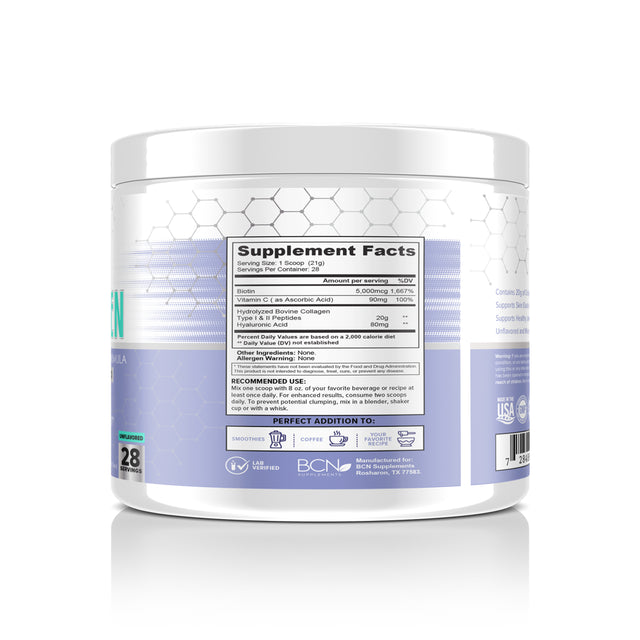 Look and feel your best with our hydrolyzed collagen powder, packed with type I and type II collagen peptides, hyaluronic acid, vitamin c and biotin to give you a boost both inside and out! Protect your joint health, skin, hair & nails by adding our flavorless collagen to your routine