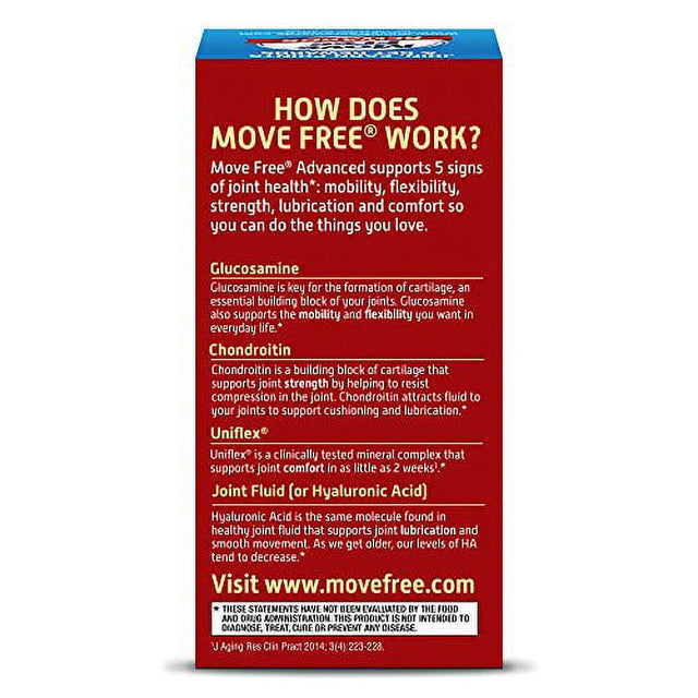 Move Free Advanced is a Glucosamine Chondroitin joint supplement that contains premium ingredients, including glucosamine, chondroitin, uniflex (calcium fructobrate), and hyaluronic acid, to promote the health of your joints. Glucosamine is key for the formation of cartilage, an essential building block of your joints to support your mobility and flexibility.* Chondroitin is a building block of cartilage that supports joint strength by helping to resist compression in the joint. Chondroitin attracts fluid to your joints to support cushioning and lubrication.* Uniflex (calcium fructobrate) is a clinically test mineral complex that supports joint comfort in as little as 2 weeks.** Hyaluronic Acid is the same molecule found in healthy joint fluid that supports joint lubrication and smooth movement. As we get older, our levels of HA tend to decrease.* *These statements have not been evaluated by the Food and Drug Administration. This product is not intended to diagnose, treat, cure or prevent any disease. **J Aging Res Clin Pract 2014; 3(4):223-228