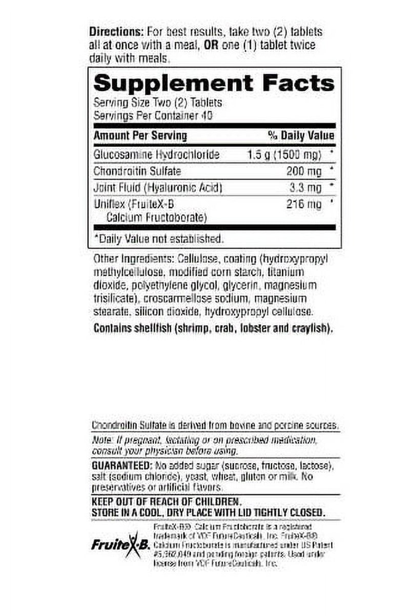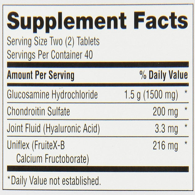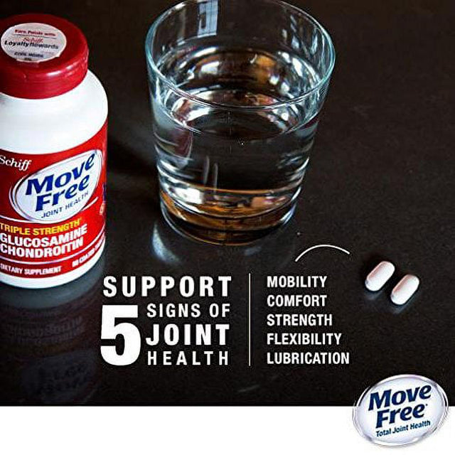 Move Free Triple Strength Glucosamine Chondroitin and Hyaluronic Acid Joint Supplement, 80 Count Supports 5 signs of joint health: Mobility, Flexibility, Strength, Lubrication, and Comfort | 2 easy to swallow coated tablets are smaller tablets than standard Glucosamine and Chondroitin pills | Contains mineral complex Uniflex, clinically tested to support joint comfort in as little as 2 weeks | Glucosamine and Chondroitin are key in the formation of cartilage to support flexibility and cushioning of your joints | Supports joint lubrication and smooth movement with Joint Fluid (Hyaluronic Acid) Directions: