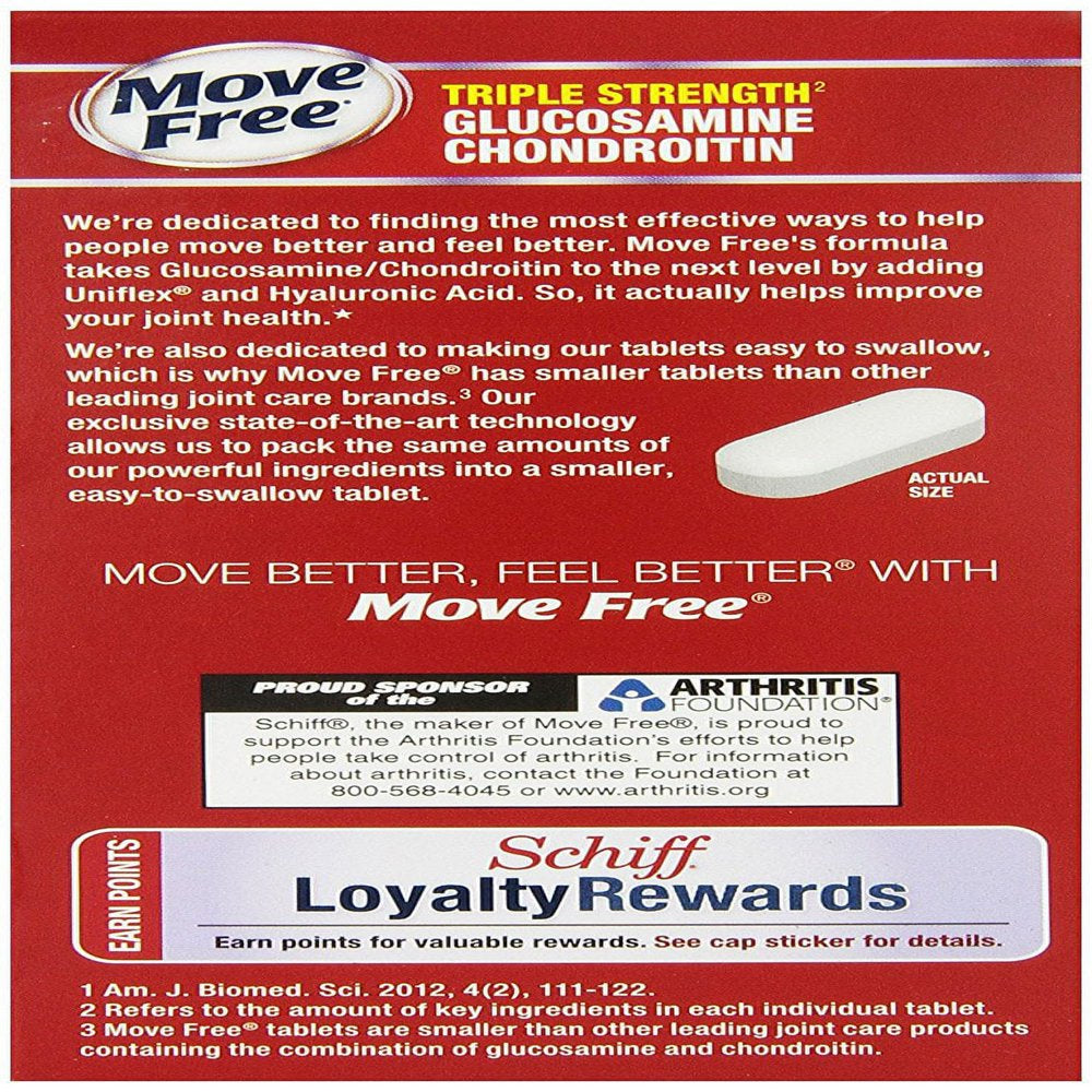 Move Free Triple Strength Glucosamine Chondroitin joint supplements contain premium-quality ingredients, including glucosamine, chondroitin, uniflex, and hyaluronic acid, to promote the health of your joints. Move Free Triple Strength promotes joint flexibility, comfort and lubrication.
