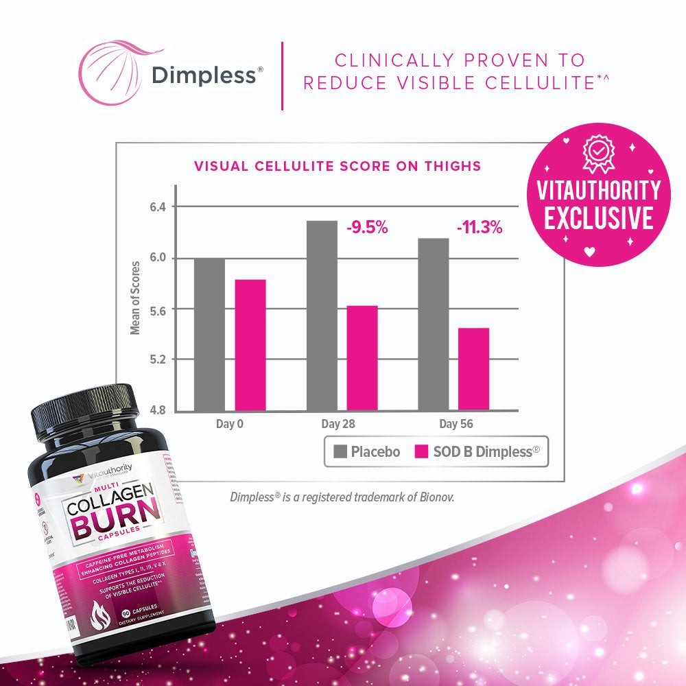 Exclusive Cellulite fighting Ingredient - SOD B Dimpless acts against the two main causes of cellulite development which are collagen fibers fibrosis and fat cells hypertrophy and has been shown to show results in just 56 days.