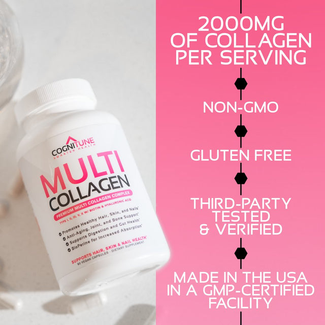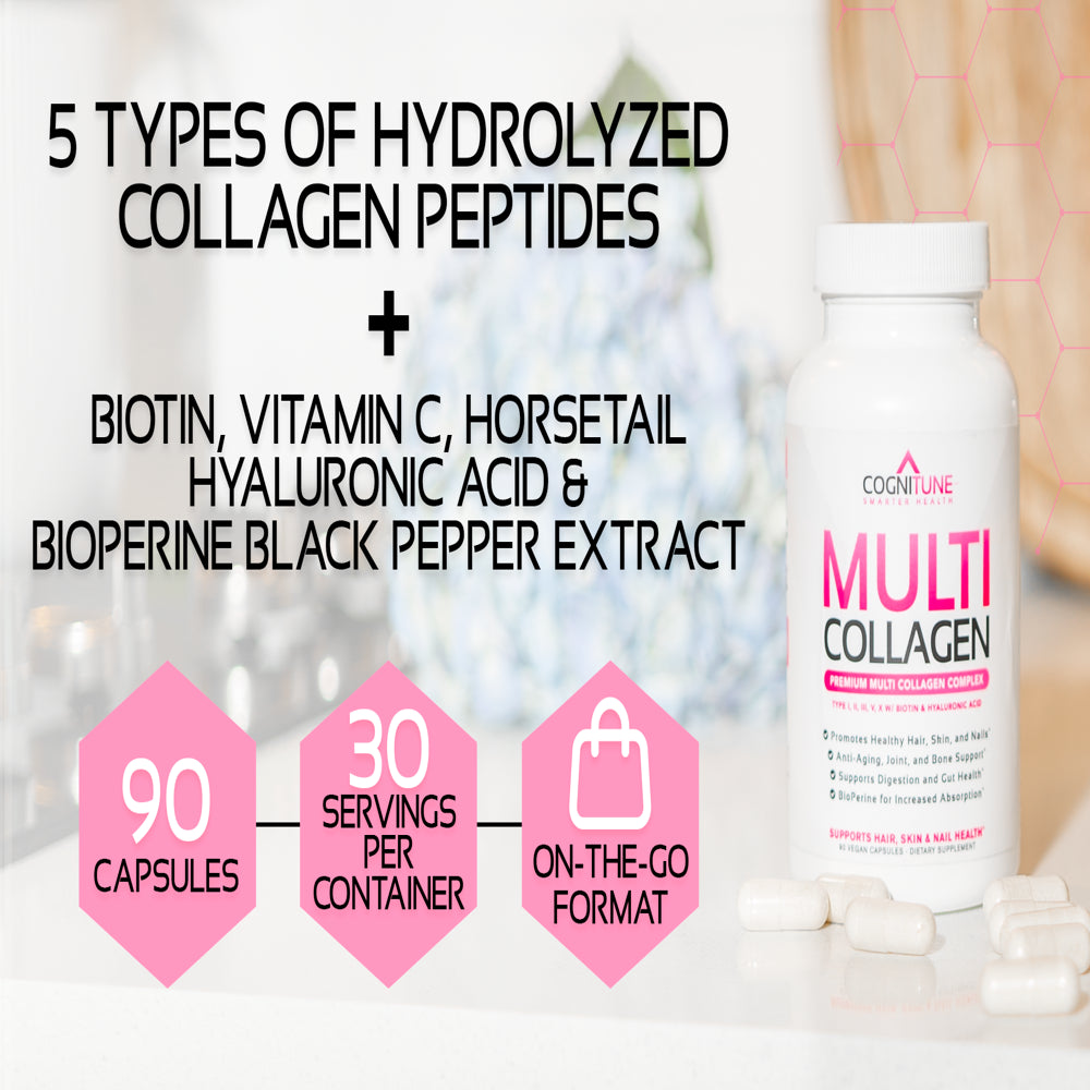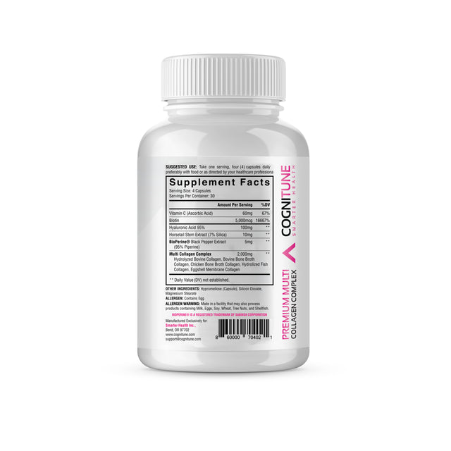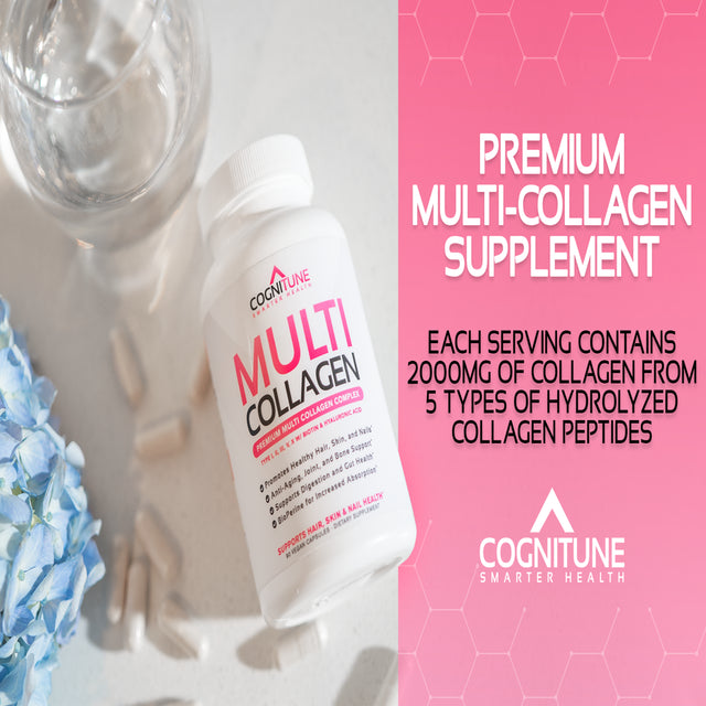 Premium Multi Collagen Complex: - Compared to other brands, the CogniTune formula has more type I, II, III, V, and X hydrolyzed collagen peptides from Hydrolyzed Bovine, Chicken Bone Broth, Hydrolyzed Fish, Eggshell Membrane & Bovine Bone Broth; Biotin and Hyaluronic Acid for hair, skin, and nails; and BioPerine and Vitamin C for superior nutrient absorption and optimized collagen production.