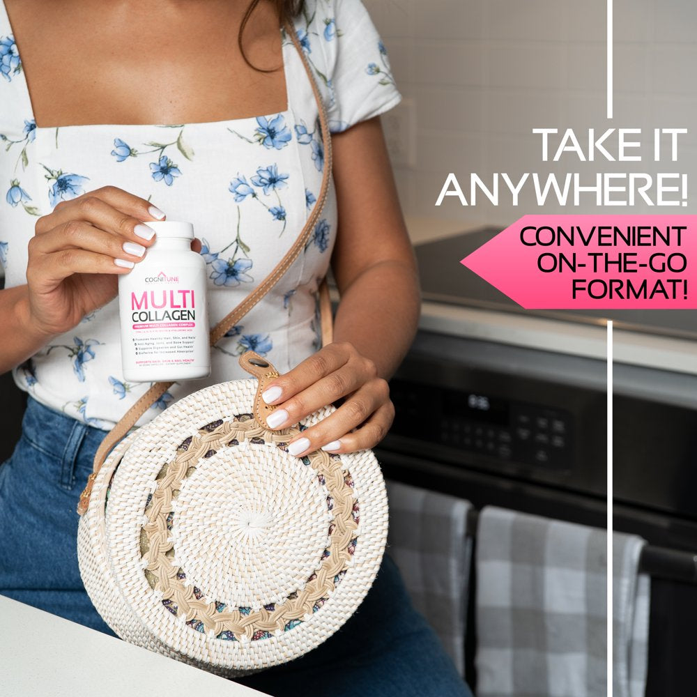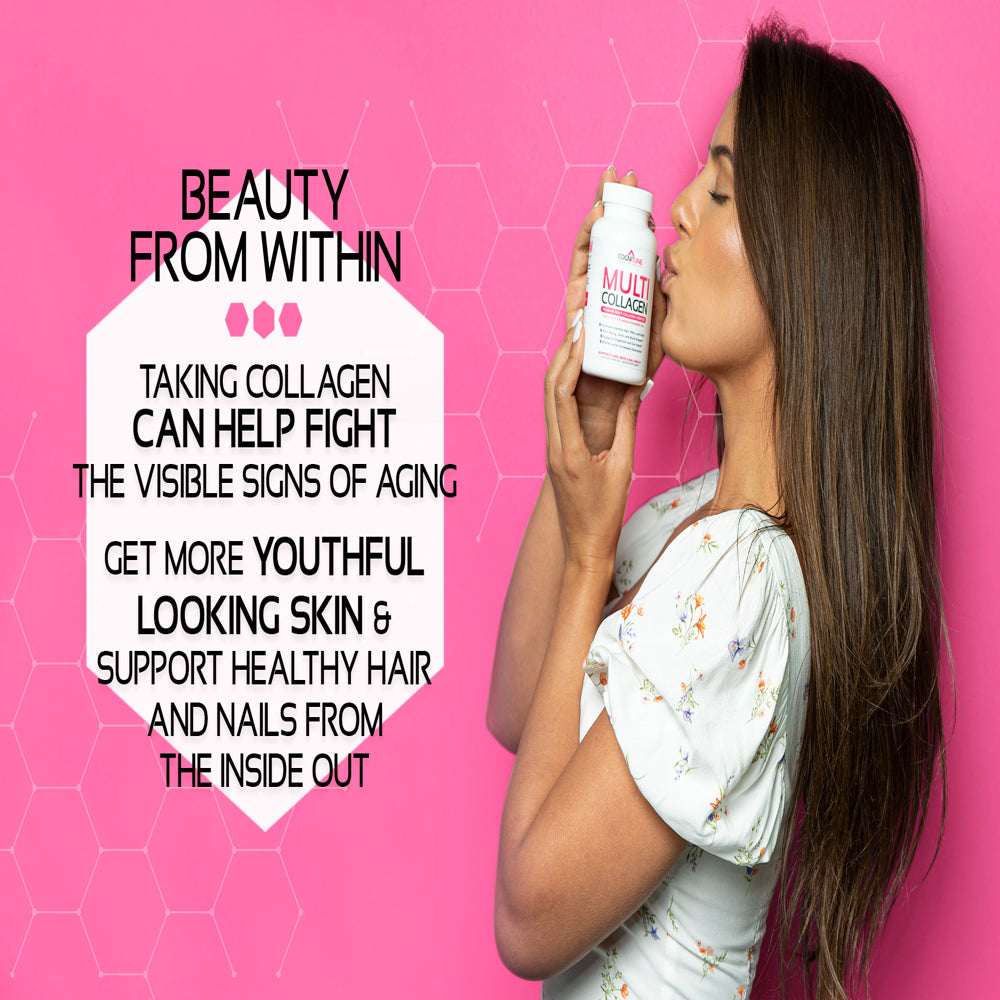 Our Multi Collagen Peptides Capsules plus Biotin, Hyaluronic Acid & Vitamin help revitalize your skin elasticity, promote hair and nail growth, and can help reduce the visible appearance of wrinkles. This complete collagen supplement is your go to for anti aging benefits.
