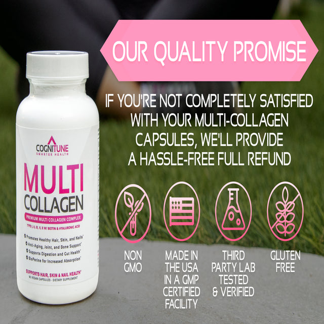 Satisfaction Guarantee: - Each bottle is Non-GMO, Gluten Free, Dairy Free, Soy Free, Made in the USA in a GMP certified facility, and Third Party lab tested and verified. If you’re not completely satisfied with your multi collagen protein capsules, we offer a hassle-free 60-day Money Back Guarantee.*