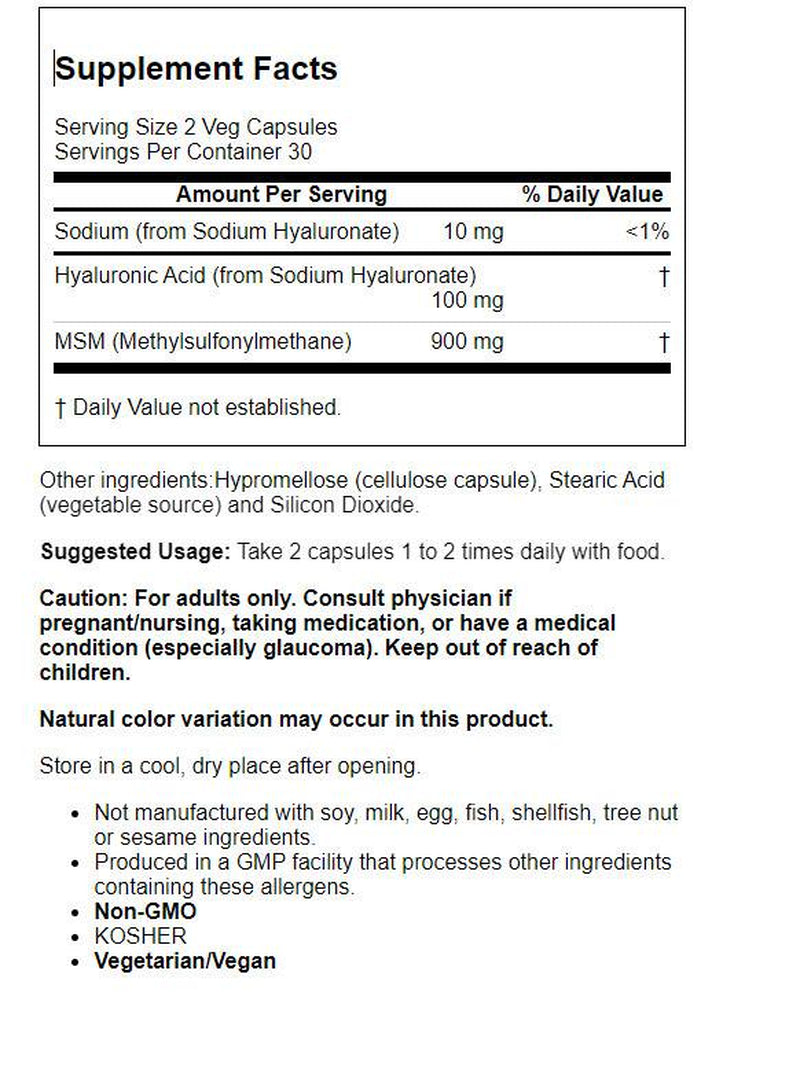 Now Foods, Hyaluronic Acid W/ MSM 50 Mg, 60 Veg Capsules is backordered and will ship as soon as it is back in stock.