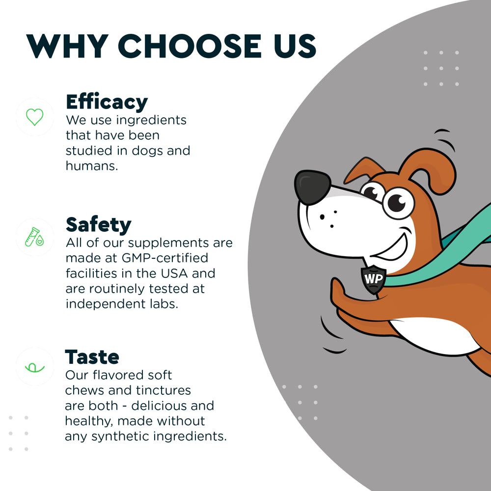GIVE YOUR FURRY FRIEND THE MOBILITY SUPERPOWER! Hey, I’m Waggy - a furry entrepreneur and maker of the finest supplements that can turn your dog into a powerful superhero. Our premium Liquid Glucosamine for pets is formulated to support healthy joints, improve mobility and flexibility, support joint lubrication, healthy bones, and keep your furry friend active and limber. We include only the best ingredients for this liquid hip and joint supplement. We have included a powerful dose of Glucosamine, Chondroitin Sulfate, MSM, Collagen, Manganese & Hyaluronic Acid. Most hip and joint liquids for dogs don’t include Collagen, but this ingredient is key to support your pet’s joint strength so they can live their best life. No matter your dog’s age, size, or breed, our extra-strength liquid glucosamine supplement for dogs can be given at any time to help relieve occasional joint stiffness and promote overall joint flexibility and comfort. This natural liquid glucosamine chondroitin supplement is delicious for your pet and easy to use. Look no further than our extra strength joint aid for dogs. Wonder Paws is a member of the prestigious National Animal Supplement Council which ensures strict quality control standards. When you give your pet our liquid joint supplement, you can be confident that you are buying the quality product on the market because we are a trusted supplier with the renowned National Animal Supplement Council. We offer a no questions asked 365 Day Money Back Guarantee because we are confident your pet will love the product. Benefits of Joint Support Supplement for Dogs: - Supports joint health - Promotes joint lubrication - Supports healthy cartilage and mobility - Supports flexibility and comfort - Supports bone health Click the "Add To Cart" Button above to try our Premium Liquid Hip And Joint Supplement for Dogs today!